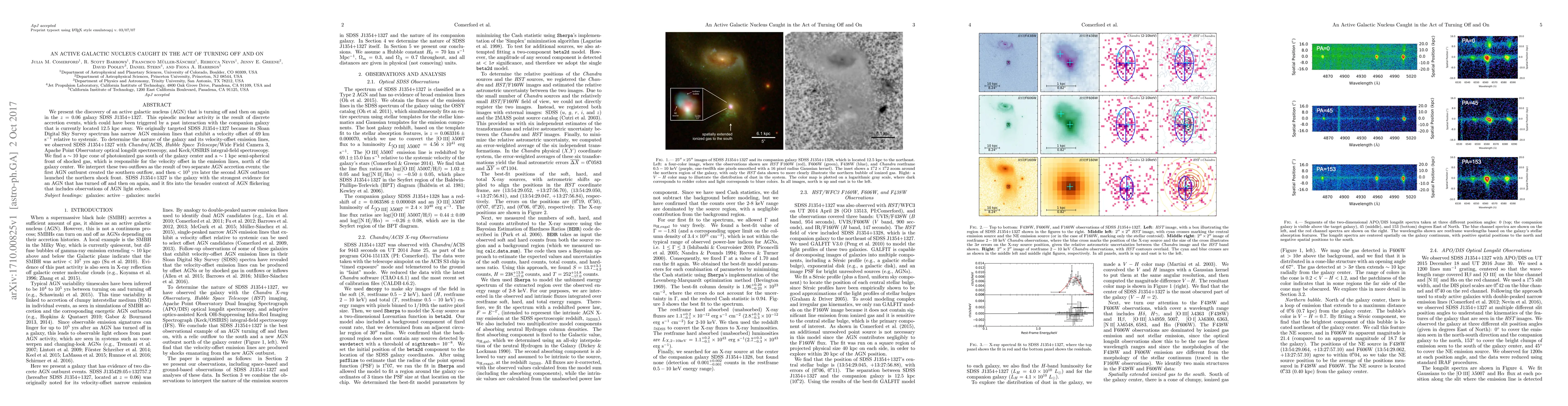 We present the discovery of an active galactic nucleus (AGN) that is turning off and then on again in the z=0.06 galaxy SDSS J1354+1327. This episodic nuclear activity is the result of discrete accretion events, which could have been triggered by a past interaction with the companion galaxy that is currently located 12.5 kpc away. We originally targeted SDSS J1354+1327 because its Sloan Digital Sky Survey spectrum has narrow AGN emission lines that exhibit a velocity offset of 69 km s$^{-1}$ relative to systemic. To determine the nature of the galaxy and its velocity-offset emission lines, we observed SDSS J1354+1327 with Chandra/ACIS, Hubble Space Telescope/Wide Field Camera 3, Apache Point Observatory optical longslit spectroscopy, and Keck/OSIRIS integral-field spectroscopy. We find a ~10 kpc cone of photoionized gas south of the galaxy center and a ~1 kpc semi-spherical front of shocked gas, which is responsible for the velocity offset in the emission lines, north of the galaxy center. We interpret these two outflows as the result of two separate AGN accretion events; the first AGN outburst created the southern outflow, and then $<10^5$ yrs later the second AGN outburst launched the northern shock front. SDSS J1354+1327 is the galaxy with the strongest evidence for an AGN that has turned off and then on again, and it fits into the broader context of AGN flickering that includes observations of AGN light echoes.
