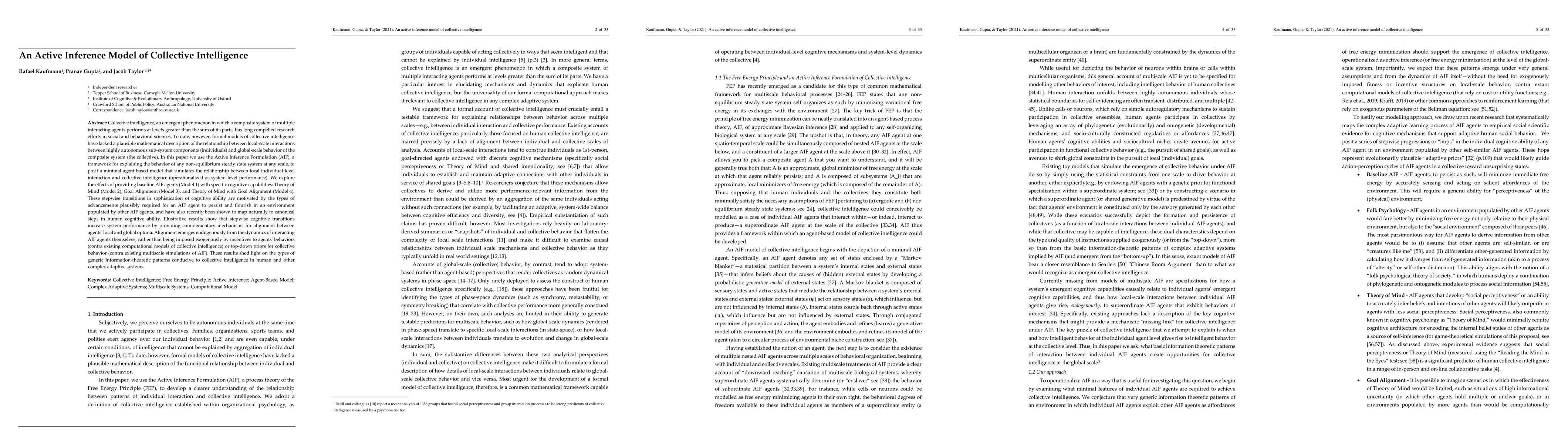 To date, formal models of collective intelligence have lacked a plausible mathematical description of the relationship between local-scale interactions between highly autonomous sub-system components (individuals) and global-scale behavior of the composite system (the collective). In this paper we use the Active Inference Formulation (AIF), a framework for explaining the behavior of any non-equilibrium steady state system at any scale, to posit a minimal agent-based model that simulates the relationship between local individual-level interaction and collective intelligence (operationalized as system-level performance). We explore the effects of providing baseline AIF agents (Model 1) with specific cognitive capabilities: Theory of Mind (Model 2); Goal Alignment (Model 3), and Theory of Mind with Goal Alignment (Model 4). These stepwise transitions in sophistication of cognitive ability are motivated by the types of advancements plausibly required for an AIF agent to persist and flourish in an environment populated by other AIF agents, and have also recently been shown to map naturally to canonical steps in human cognitive ability. Illustrative results show that stepwise cognitive transitions increase system performance by providing complementary mechanisms for alignment between agents' local and global optima. Alignment emerges endogenously from the dynamics of interacting AIF agents themselves, rather than being imposed exogenously by incentives to agents' behaviors (contra existing computational models of collective intelligence) or top-down priors for collective behavior (contra existing multiscale simulations of AIF). These results shed light on the types of generic information-theoretic patterns conducive to collective intelligence in human and other complex adaptive systems.
