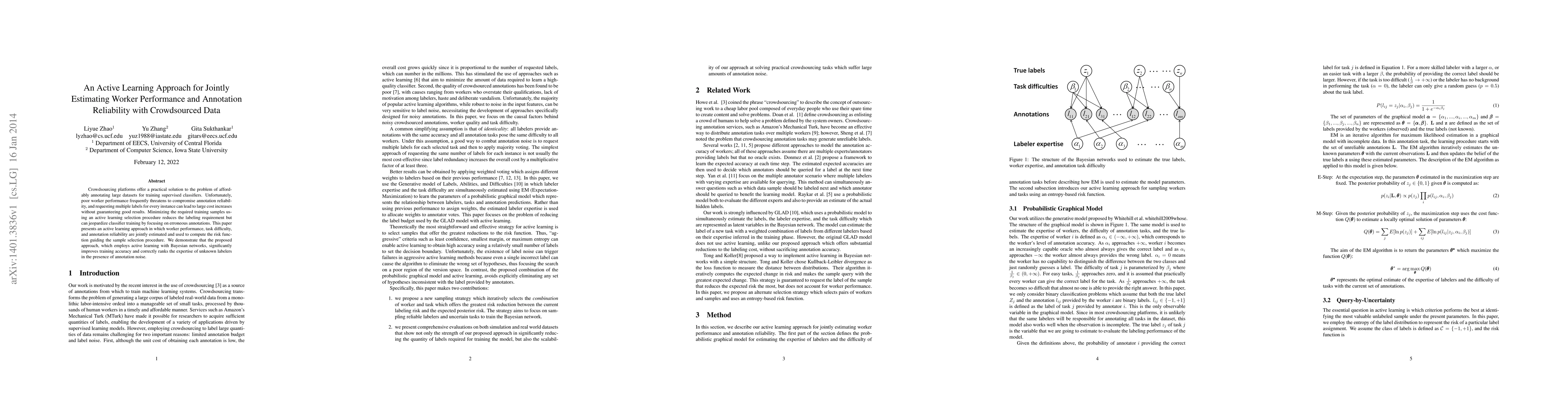 Crowdsourcing platforms offer a practical solution to the problem of affordably annotating large datasets for training supervised classifiers. Unfortunately, poor worker performance frequently threatens to compromise annotation reliability, and requesting multiple labels for every instance can lead to large cost increases without guaranteeing good results. Minimizing the required training samples using an active learning selection procedure reduces the labeling requirement but can jeopardize classifier training by focusing on erroneous annotations. This paper presents an active learning approach in which worker performance, task difficulty, and annotation reliability are jointly estimated and used to compute the risk function guiding the sample selection procedure. We demonstrate that the proposed approach, which employs active learning with Bayesian networks, significantly improves training accuracy and correctly ranks the expertise of unknown labelers in the presence of annotation noise.