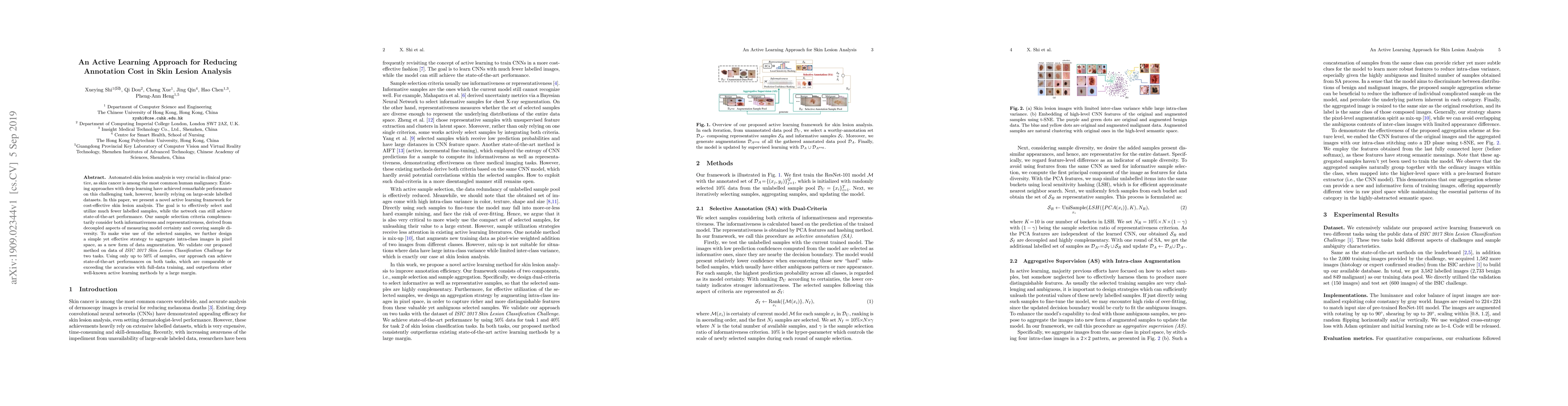 This paper introduces an active learning framework for reducing annotation costs in skin lesion analysis, achieving state-of-the-art performance using only half the labeled data. The method selects informative and representative samples based on model certainty and diversity, and uses aggregated intra-class images for data augmentation.