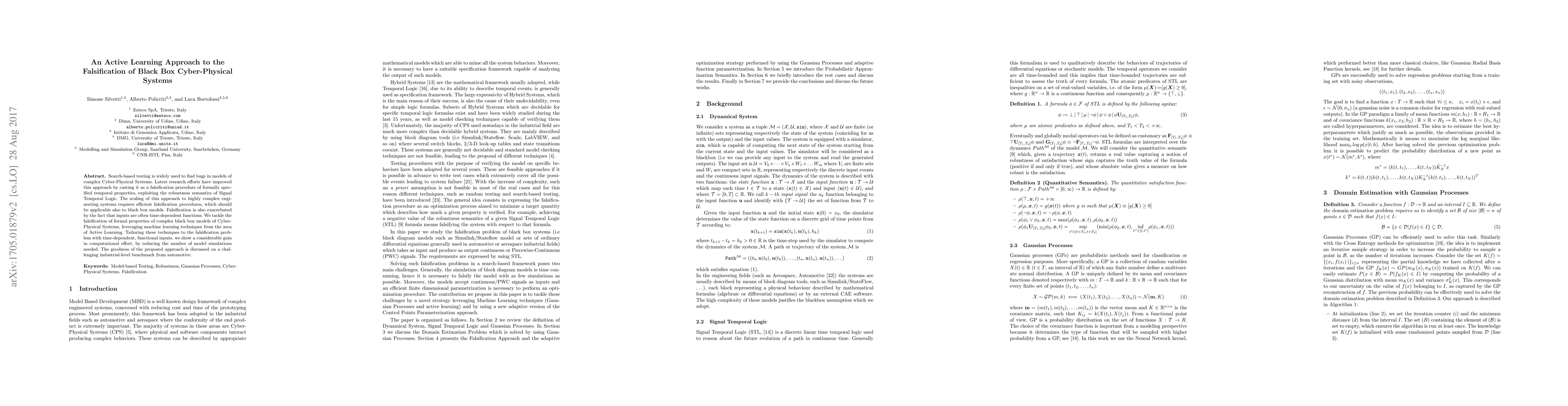 This paper proposes an active learning approach to efficiently falsify formal properties in black box models of complex Cyber-Physical Systems, leveraging machine learning techniques to reduce computational effort and the number of required simulations. The method is demonstrated on a challenging automotive benchmark, showing significant improvements over traditional methods.