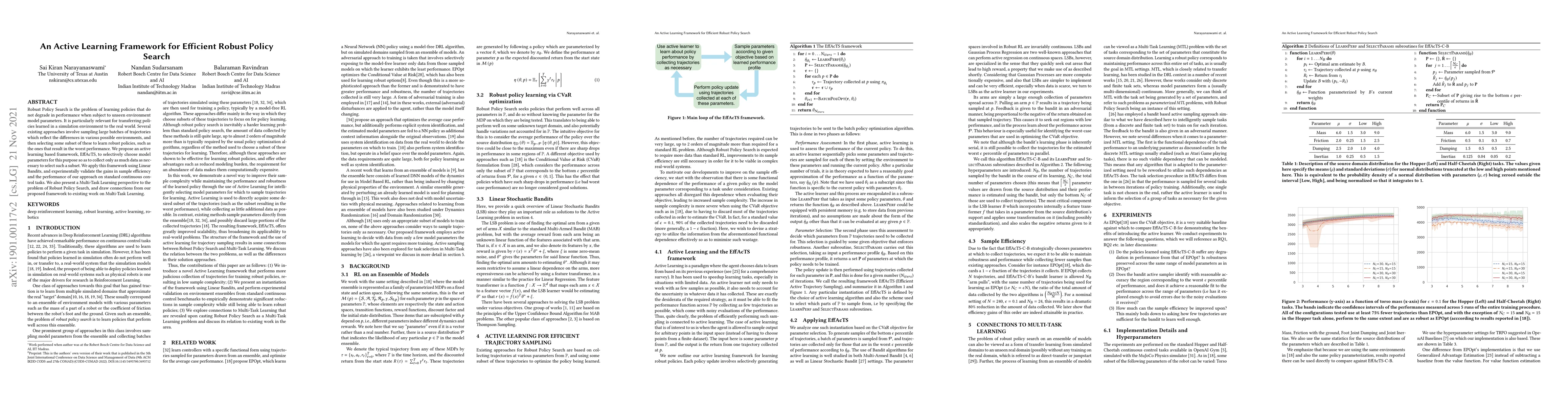 Robust Policy Search is the problem of learning policies that do not degrade in performance when subject to unseen environment model parameters. It is particularly relevant for transferring policies learned in a simulation environment to the real world. Several existing approaches involve sampling large batches of trajectories which reflect the differences in various possible environments, and then selecting some subset of these to learn robust policies, such as the ones that result in the worst performance. We propose an active learning based framework, EffAcTS, to selectively choose model parameters for this purpose so as to collect only as much data as necessary to select such a subset. We apply this framework using Linear Bandits, and experimentally validate the gains in sample efficiency and the performance of our approach on standard continuous control tasks. We also present a Multi-Task Learning perspective to the problem of Robust Policy Search, and draw connections from our proposed framework to existing work on Multi-Task Learning.