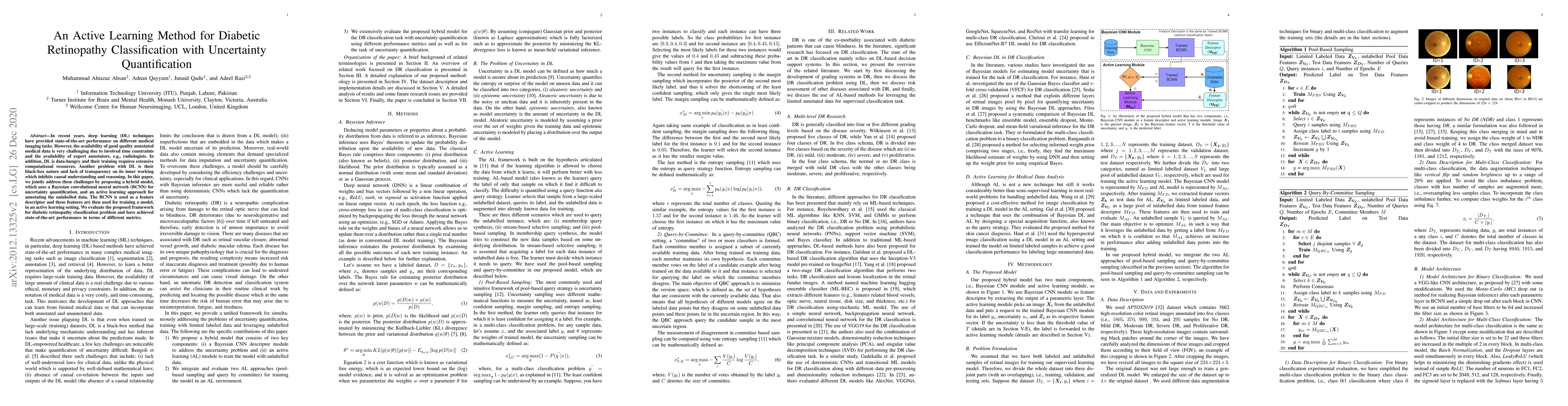 In recent years, deep learning (DL) techniques have provided state-of-the-art performance on different medical imaging tasks. However, the availability of good quality annotated medical data is very challenging due to involved time constraints and the availability of expert annotators, e.g., radiologists. In addition, DL is data-hungry and their training requires extensive computational resources. Another problem with DL is their black-box nature and lack of transparency on its inner working which inhibits causal understanding and reasoning. In this paper, we jointly address these challenges by proposing a hybrid model, which uses a Bayesian convolutional neural network (BCNN) for uncertainty quantification, and an active learning approach for annotating the unlabelled data. The BCNN is used as a feature descriptor and these features are then used for training a model, in an active learning setting. We evaluate the proposed framework for diabetic retinopathy classification problem and have achieved state-of-the-art performance in terms of different metrics.