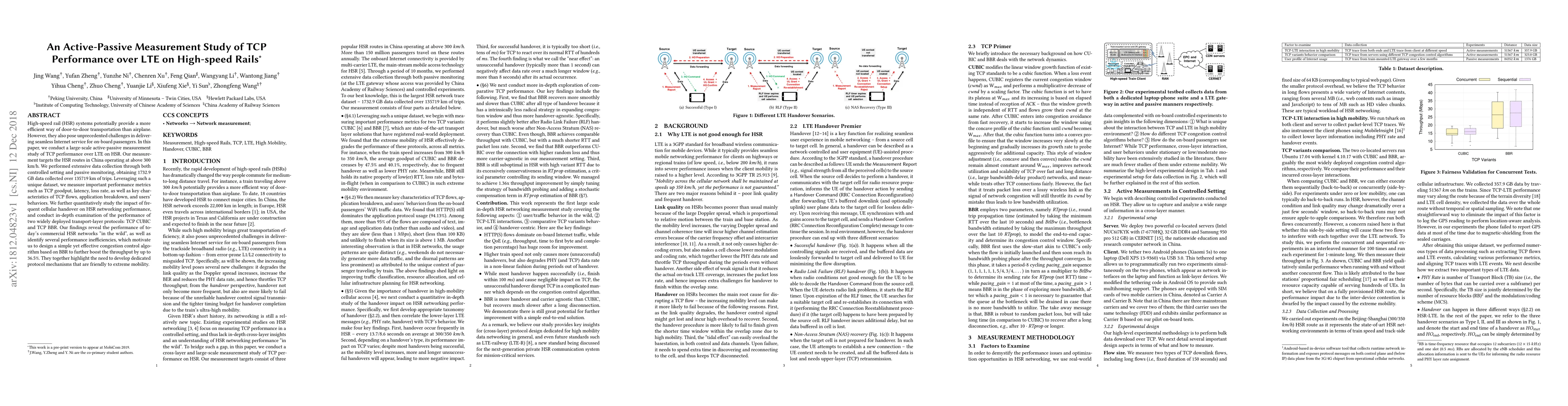 This paper conducts an extensive active-passive measurement study of TCP performance over LTE on high-speed rail (HSR) in China, collecting 1732.9 GB of data over 135,719 km. It reveals performance inefficiencies and proposes a congestion control algorithm based on BBR to improve throughput by up to 36.5%, highlighting the need for protocols suited to extreme mobility.