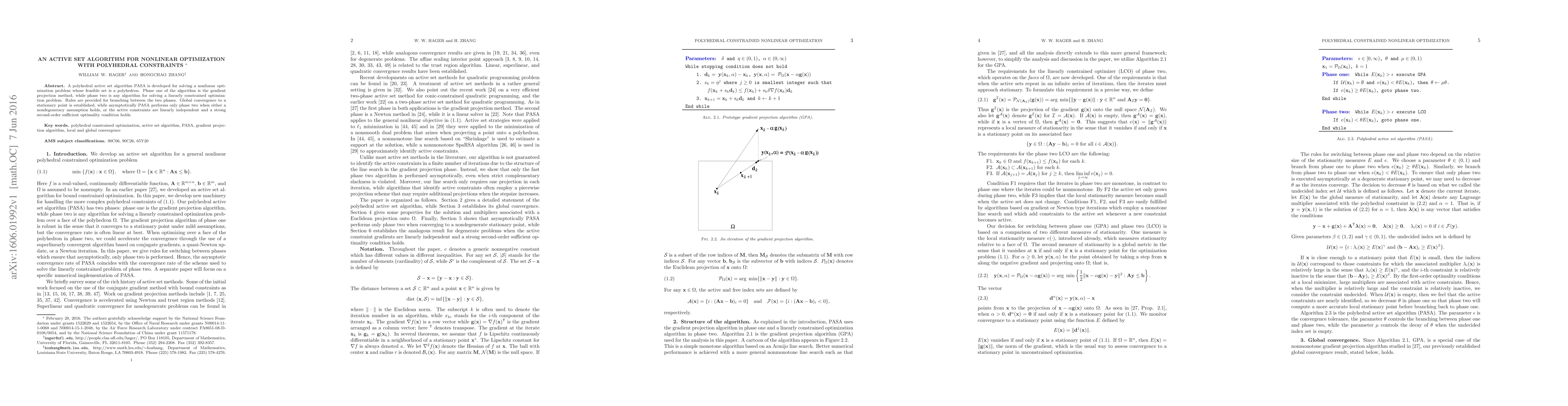 This paper introduces PASA, a polyhedral active set algorithm for nonlinear optimization with polyhedral constraints, combining gradient projection and linearly constrained optimization methods. It ensures global convergence to a stationary point and operates primarily in the second phase under certain conditions.