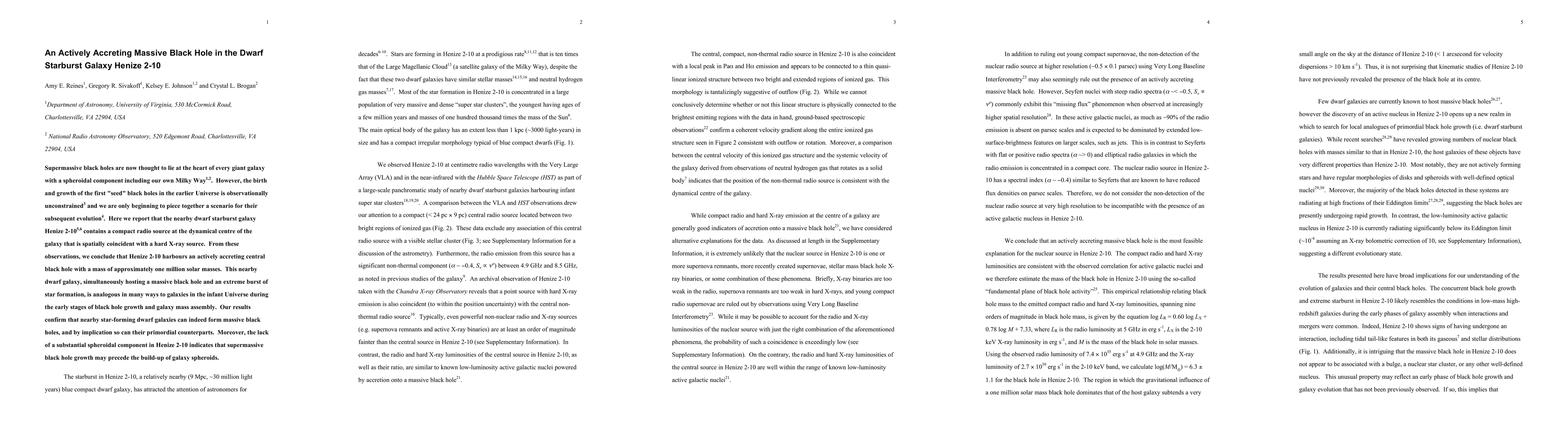 The dwarf starburst galaxy Henize 2-10 hosts an actively accreting supermassive black hole with a mass of about one million solar masses, suggesting that massive black holes can form even in star-forming dwarf galaxies, potentially before the development of galaxy spheroids.