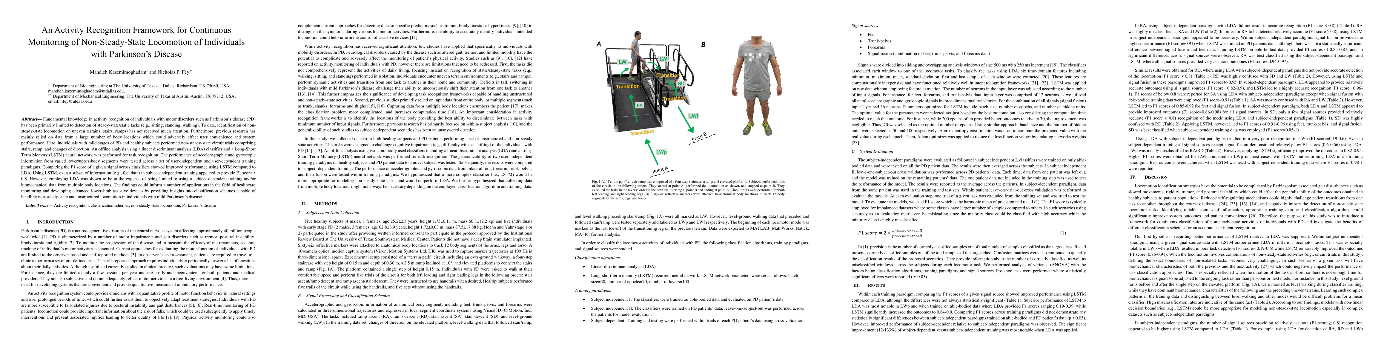 This paper proposes an activity recognition framework for monitoring non-steady-state locomotion in individuals with Parkinson's disease using LSTM neural networks, showing improved performance over linear discriminant analysis. The study highlights the potential of using limited sensor data for effective classification.