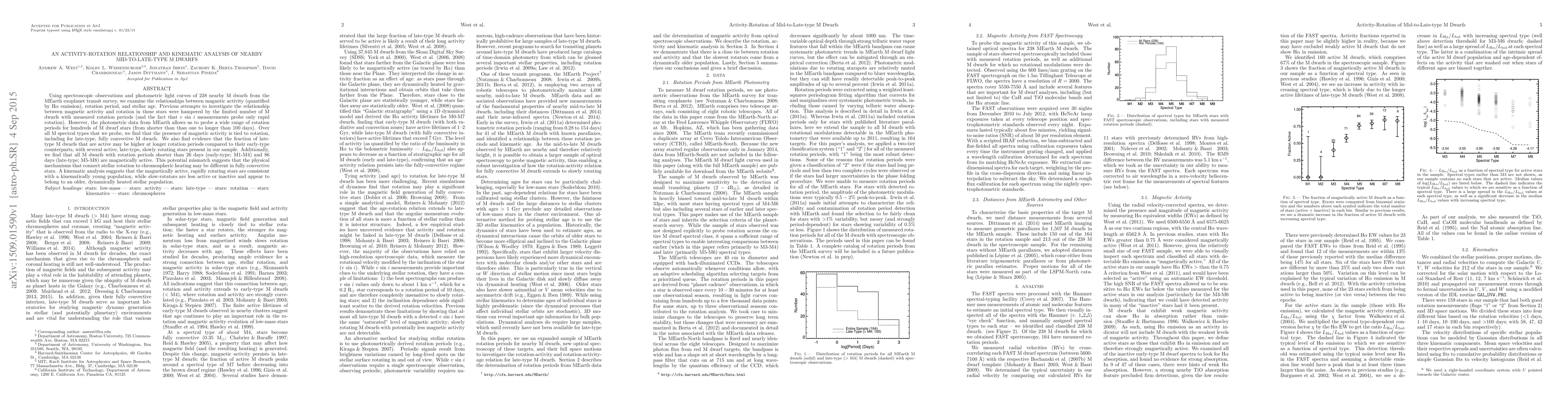 Using spectroscopic observations and photometric light curves of 238 nearby M dwarfs from the MEarth exoplanet transit survey, we examine the relationships between magnetic activity (quantified by H-alpha emission), rotation period, and stellar age. Previous attempts to investigate the relationship between magnetic activity and rotation in these stars were hampered by the limited number of M dwarfs with measured rotation periods (and the fact that vsini measurements probe only rapid rotation). However, the photometric data from MEarth allows us to probe a wide range of rotation periods for hundreds of M dwarf stars (from shorter than than one to longer than 100 days). Over all M spectral types that we probe, we find that the presence of magnetic activity is tied to rotation, including for late-type, fully convective M dwarfs. We also find evidence that the fraction of late-type M dwarfs that are active may be higher at longer rotation periods compared to their early-type counterparts, with several active, late-type, slowly rotating stars present in our sample. Additionally, we find that all M dwarfs with rotation periods shorter than 26 days (early-type; M1-M4) and 86 days (late-type; M5-M8) are magnetically active. This potential mismatch suggests that the physical mechanisms that connect stellar rotation to chromospheric heating may be different in fully convective stars. A kinematic analysis suggests that the magnetically active, rapidly rotating stars are consistent with a kinematically young population, while slow-rotators are less active or inactive and appear to belong to an older, dynamically heated stellar population.