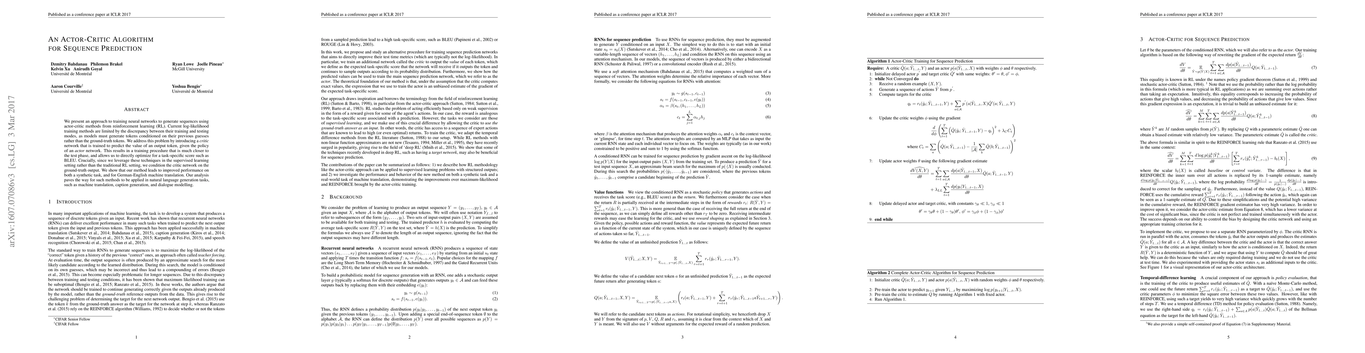 This paper presents an actor-critic algorithm for sequence prediction, addressing the discrepancy between training and testing in neural networks by introducing a critic network trained to predict the value of output tokens conditioned on the actor network's policy. The method shows improved performance on synthetic tasks and German-English machine translation, suggesting its potential for natural language generation tasks.