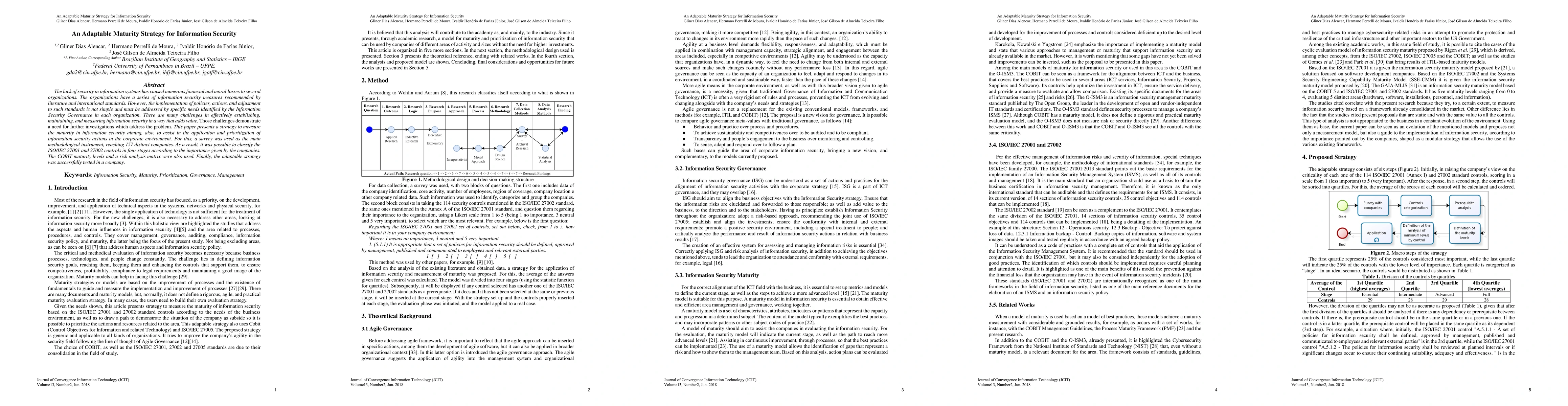 The lack of security in information systems has caused numerous financial and moral losses to several organizations. The organizations have a series of information security measures recommended by literature and international standards. However, the implementation of policies, actions, and adjustment to such standards is not simple and must be addressed by specific needs identified by the Information Security Governance in each organization. There are many challenges in effectively establishing, maintaining, and measuring information security in a way that adds value. Those challenges demonstrate a need for further investigations which address the problem. This paper presents a strategy to measure the maturity in information security aiming, also, to assist in the application and prioritization of information security actions in the corporate environment. For this, a survey was used as the main methodological instrument, reaching 157 distinct companies. As a result, it was possible to classify the ISO/IEC 27001 and 27002 controls in four stages according to the importance given by the companies. The COBIT maturity levels and a risk analysis matrix were also used. Finally, the adaptable strategy was successfully tested in a company