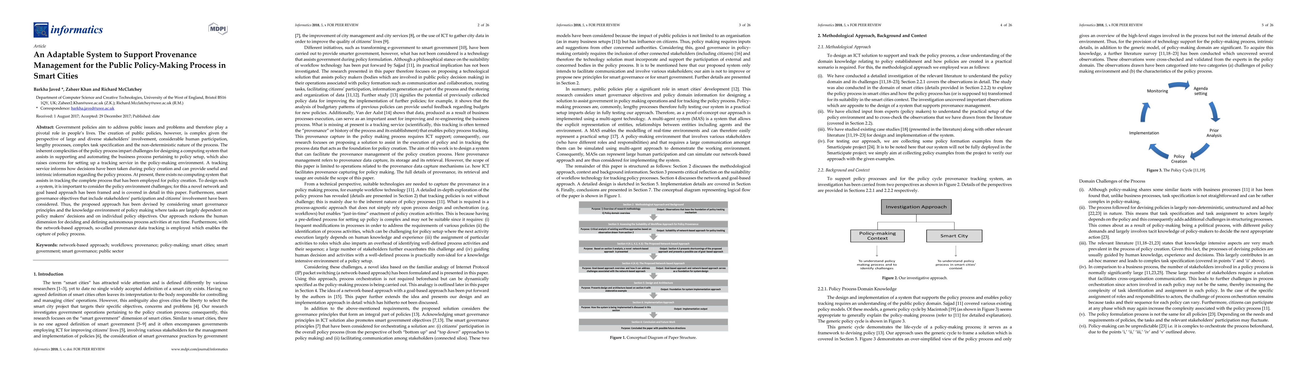 This paper proposes an adaptable system for managing provenance in the public policy-making process in smart cities, addressing the complexities of stakeholder involvement and decision-making. The system employs a novel network and goal-based approach to track policy creation processes, incorporating smart governance principles and capturing human-driven process activities.