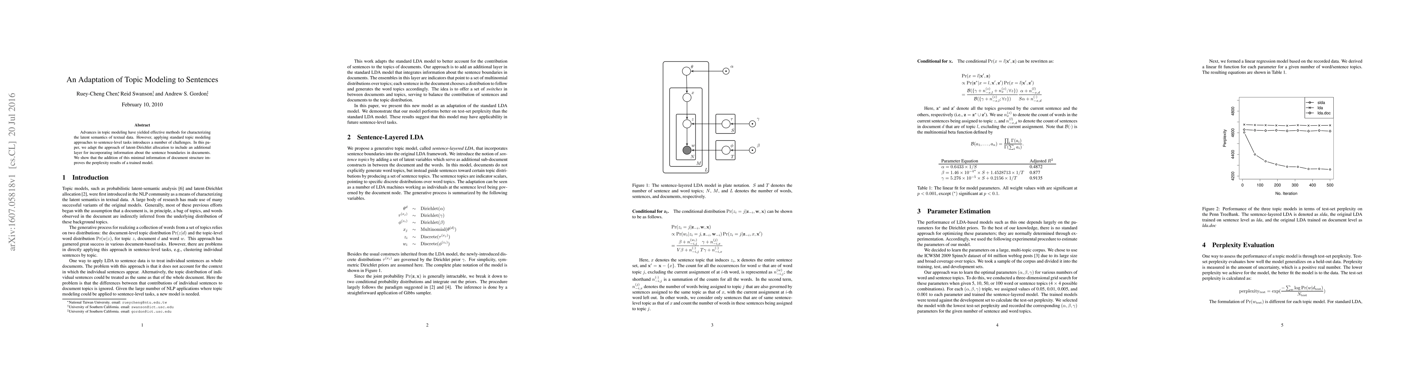 Advances in topic modeling have yielded effective methods for characterizing the latent semantics of textual data. However, applying standard topic modeling approaches to sentence-level tasks introduces a number of challenges. In this paper, we adapt the approach of latent-Dirichlet allocation to include an additional layer for incorporating information about the sentence boundaries in documents. We show that the addition of this minimal information of document structure improves the perplexity results of a trained model.
