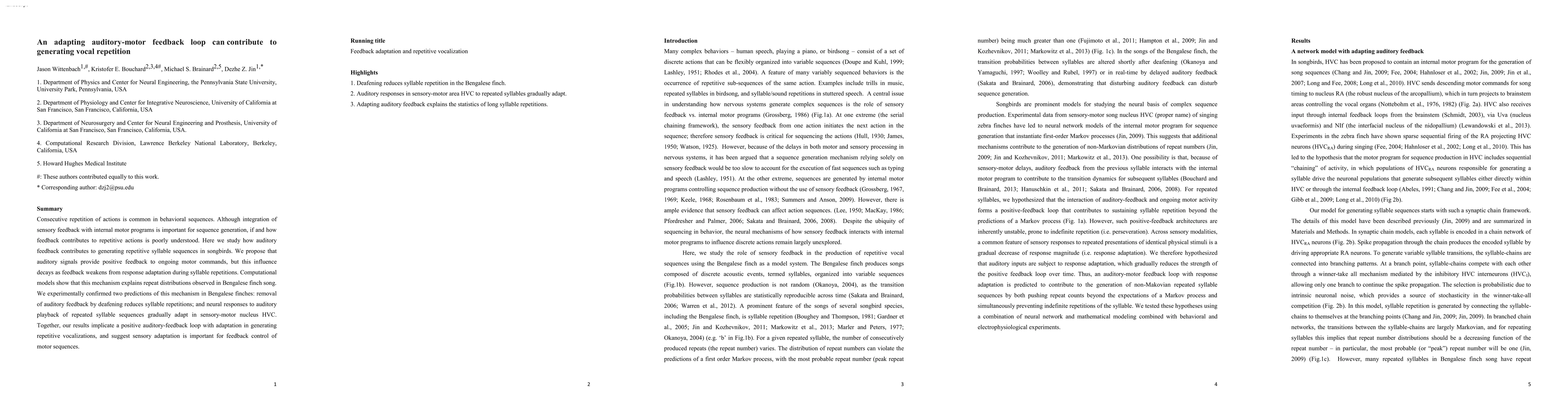 This study investigates how auditory feedback contributes to generating repetitive syllable sequences in songbirds, proposing that feedback decays with adaptation, which is crucial for controlling motor sequences. Experimental results confirm that auditory feedback reduction decreases syllable repetitions and neural responses adapt in the HVC nucleus.
