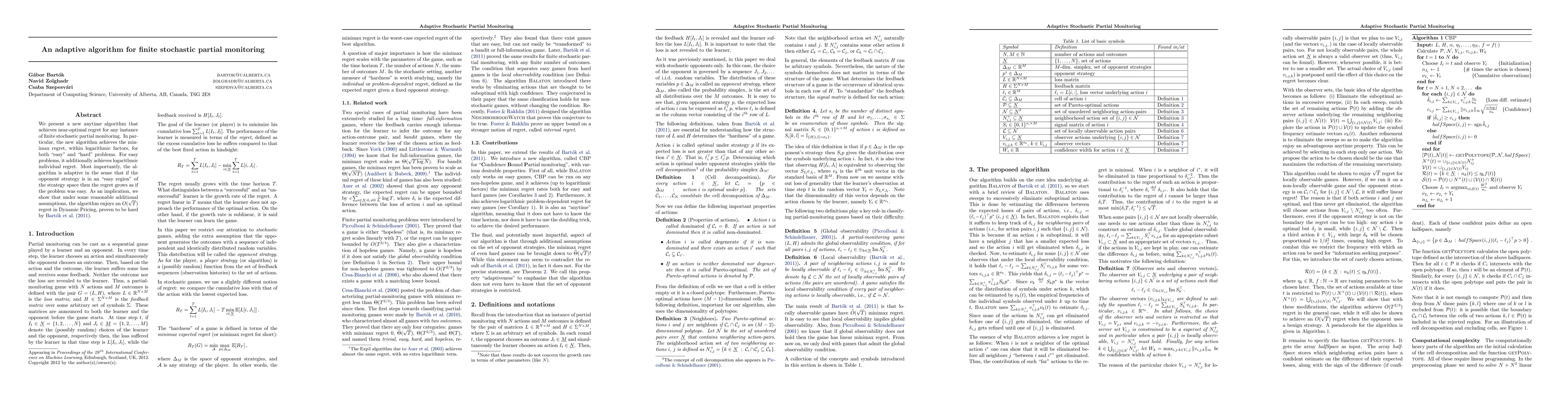We present a new anytime algorithm that achieves near-optimal regret for any instance of finite stochastic partial monitoring. In particular, the new algorithm achieves the minimax regret, within logarithmic factors, for both "easy" and "hard" problems. For easy problems, it additionally achieves logarithmic individual regret. Most importantly, the algorithm is adaptive in the sense that if the opponent strategy is in an "easy region" of the strategy space then the regret grows as if the problem was easy. As an implication, we show that under some reasonable additional assumptions, the algorithm enjoys an O(\sqrt{T}) regret in Dynamic Pricing, proven to be hard by Bartok et al. (2011).