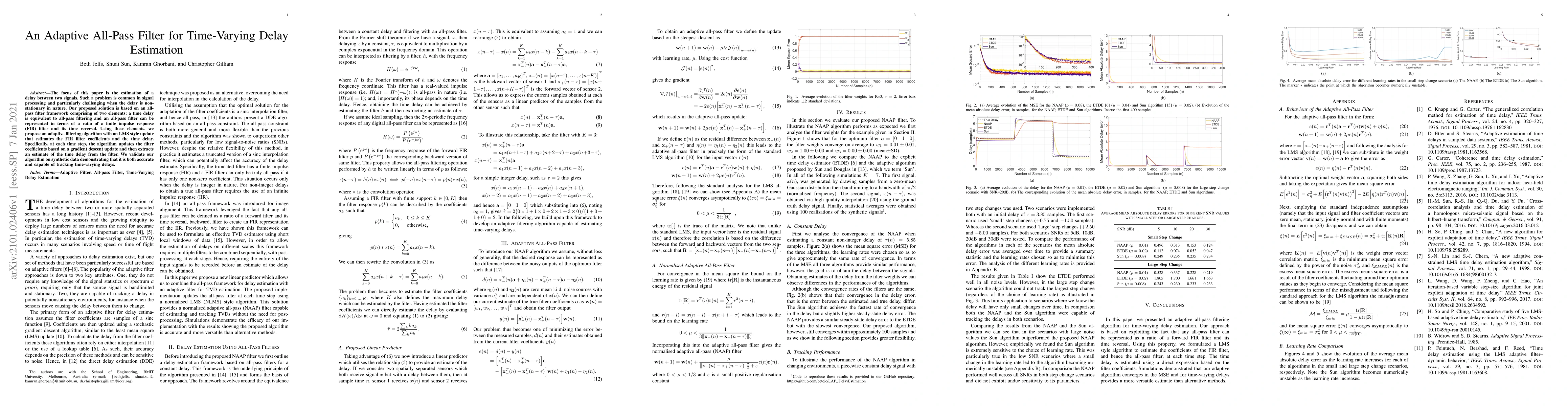 This paper proposes an adaptive all-pass filter algorithm for estimating time-varying delays between signals, utilizing an LMS-style update to adjust FIR filter coefficients and extract delay estimates. The method is validated on synthetic data, showing accuracy and effective tracking of non-stationary delays.