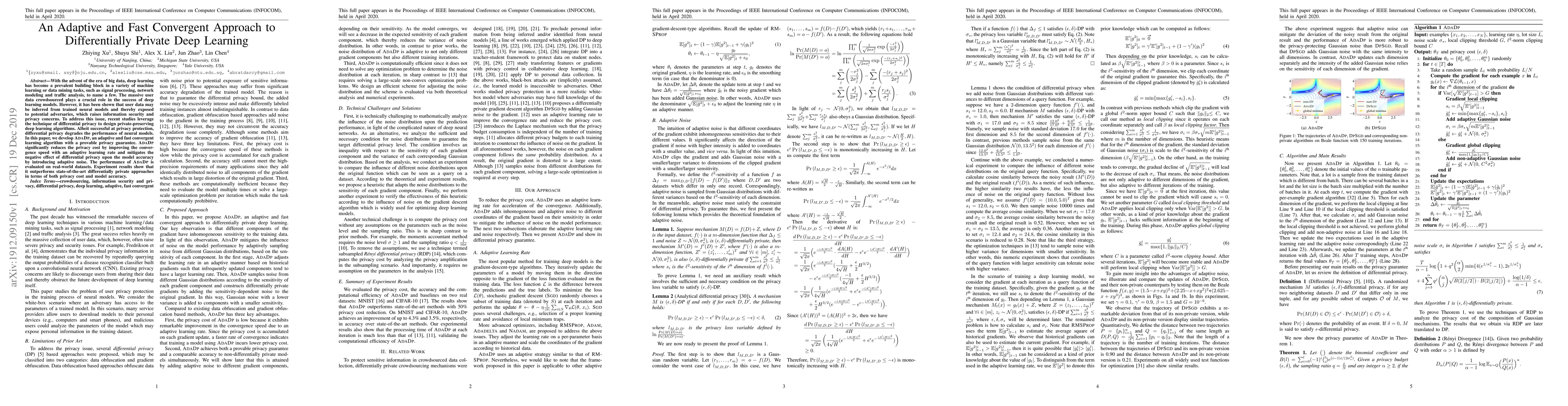 With the advent of the era of big data, deep learning has become a prevalent building block in a variety of machine learning or data mining tasks, such as signal processing, network modeling and traffic analysis, to name a few. The massive user data crowdsourced plays a crucial role in the success of deep learning models. However, it has been shown that user data may be inferred from trained neural models and thereby exposed to potential adversaries, which raises information security and privacy concerns. To address this issue, recent studies leverage the technique of differential privacy to design private-preserving deep learning algorithms. Albeit successful at privacy protection, differential privacy degrades the performance of neural models. In this paper, we develop ADADP, an adaptive and fast convergent learning algorithm with a provable privacy guarantee. ADADP significantly reduces the privacy cost by improving the convergence speed with an adaptive learning rate and mitigates the negative effect of differential privacy upon the model accuracy by introducing adaptive noise. The performance of ADADP is evaluated on real-world datasets. Experiment results show that it outperforms state-of-the-art differentially private approaches in terms of both privacy cost and model accuracy.