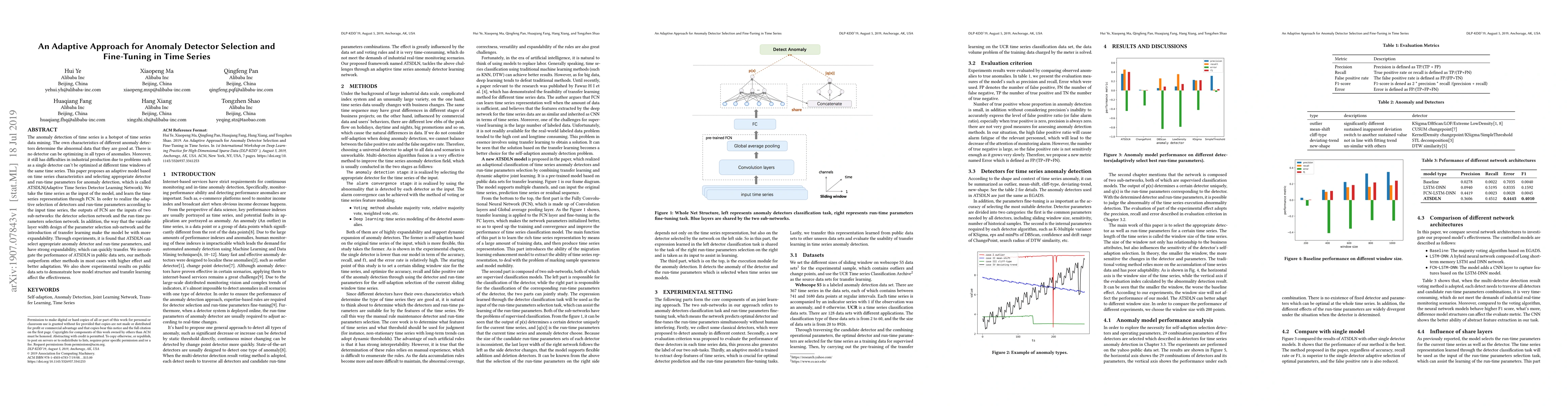 The anomaly detection of time series is a hotspot of time series data mining. The own characteristics of different anomaly detectors determine the abnormal data that they are good at. There is no detector can be optimizing in all types of anomalies. Moreover, it still has difficulties in industrial production due to problems such as a single detector can't be optimized at different time windows of the same time series. This paper proposes an adaptive model based on time series characteristics and selecting appropriate detector and run-time parameters for anomaly detection, which is called ATSDLN(Adaptive Time Series Detector Learning Network). We take the time series as the input of the model, and learn the time series representation through FCN. In order to realize the adaptive selection of detectors and run-time parameters according to the input time series, the outputs of FCN are the inputs of two sub-networks: the detector selection network and the run-time parameters selection network. In addition, the way that the variable layer width design of the parameter selection sub-network and the introduction of transfer learning make the model be with more expandability. Through experiments, it is found that ATSDLN can select appropriate anomaly detector and run-time parameters, and have strong expandability, which can quickly transfer. We investigate the performance of ATSDLN in public data sets, our methods outperform other methods in most cases with higher effect and better adaptation. We also show experimental results on public data sets to demonstrate how model structure and transfer learning affect the effectiveness.