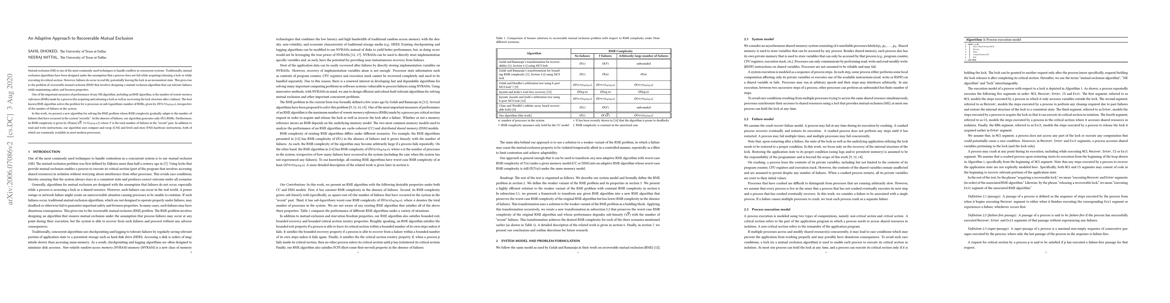 This paper proposes a novel adaptive algorithm for recoverable mutual exclusion (RME) that minimizes remote memory references (RMRs) based on recent failure rates. The algorithm performs $\mathcal{O}(1)$ RMRs in the absence of failures, adapting to $\mathcal{O}(\min\{ \sqrt{F}, \frac{\log n}{\log \log n} \})$ RMRs where $F$ is the number of recent failures.