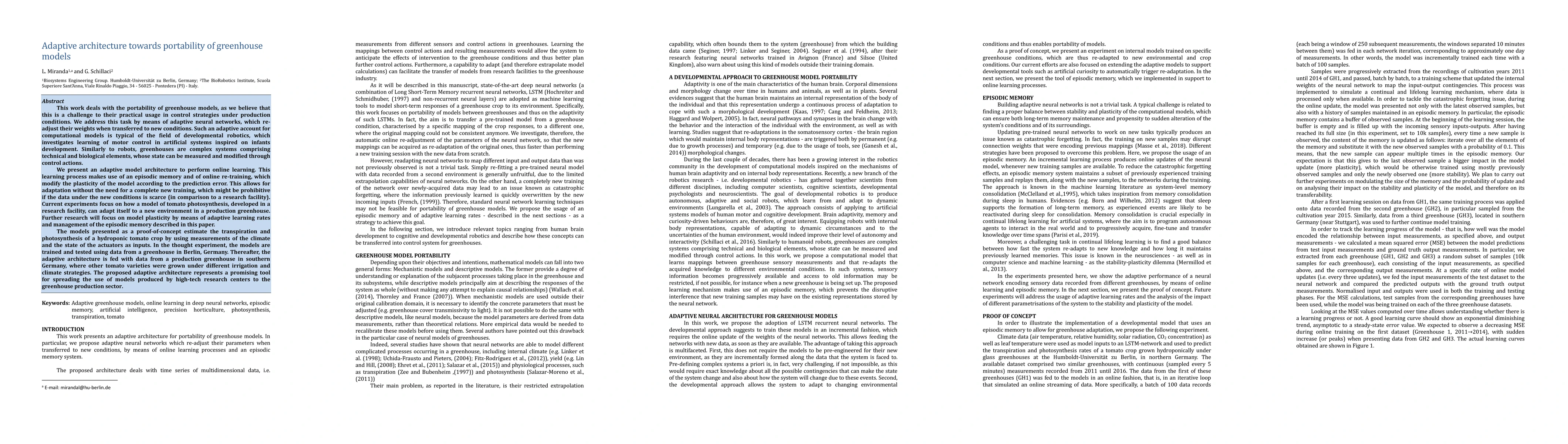 This research introduces an adaptive neural network architecture for greenhouse models, enabling them to adjust to new conditions without extensive retraining. The methodology uses online learning and episodic memory, tested with a tomato photosynthesis model transitioning from a research greenhouse in Berlin to a production greenhouse in southern Germany. The adaptive architecture shows promise for applying high-tech research models in commercial greenhouse settings.