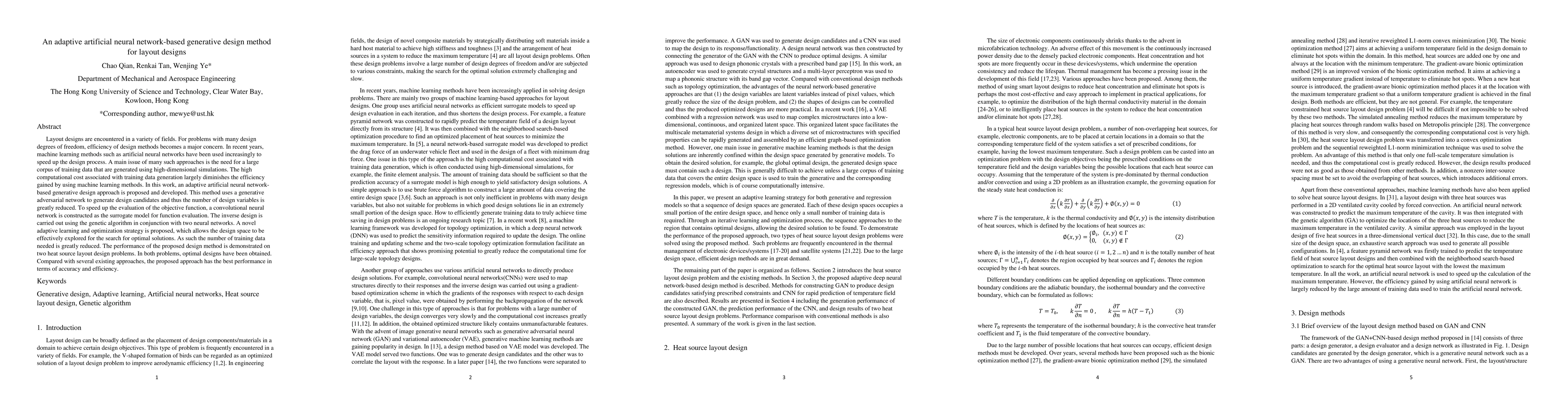 This paper proposes an adaptive artificial neural network-based generative design method that utilizes a generative adversarial network to generate design candidates and a convolutional neural network as a surrogate model for efficient evaluation. The method significantly reduces the need for extensive training data, demonstrating superior accuracy and efficiency in heat source layout design problems.
