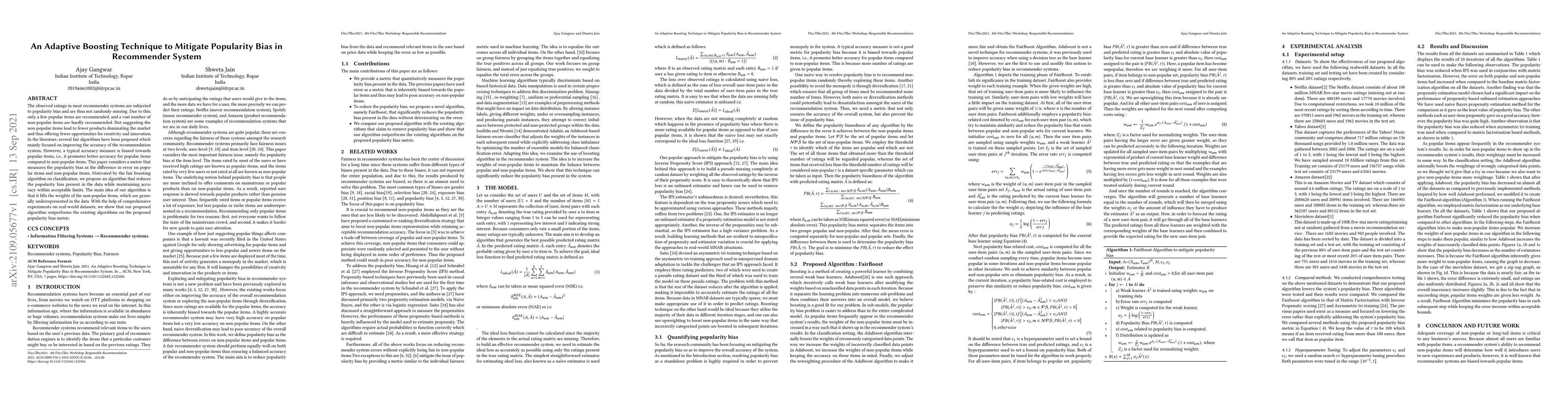 The observed ratings in most recommender systems are subjected to popularity bias and are thus not randomly missing. Due to this, only a few popular items are recommended, and a vast number of non-popular items are hardly recommended. Not suggesting the non-popular items lead to fewer products dominating the market and thus offering fewer opportunities for creativity and innovation. In the literature, several fair algorithms have been proposed which mainly focused on improving the accuracy of the recommendation system. However, a typical accuracy measure is biased towards popular items, i.e., it promotes better accuracy for popular items compared to non-popular items. This paper considers a metric that measures the popularity bias as the difference in error on popular items and non-popular items. Motivated by the fair boosting algorithm on classification, we propose an algorithm that reduces the popularity bias present in the data while maintaining accuracy within acceptable limits. The main idea of our algorithm is that it lifts the weights of the non-popular items, which are generally underrepresented in the data. With the help of comprehensive experiments on real-world datasets, we show that our proposed algorithm outperforms the existing algorithms on the proposed popularity bias metric.