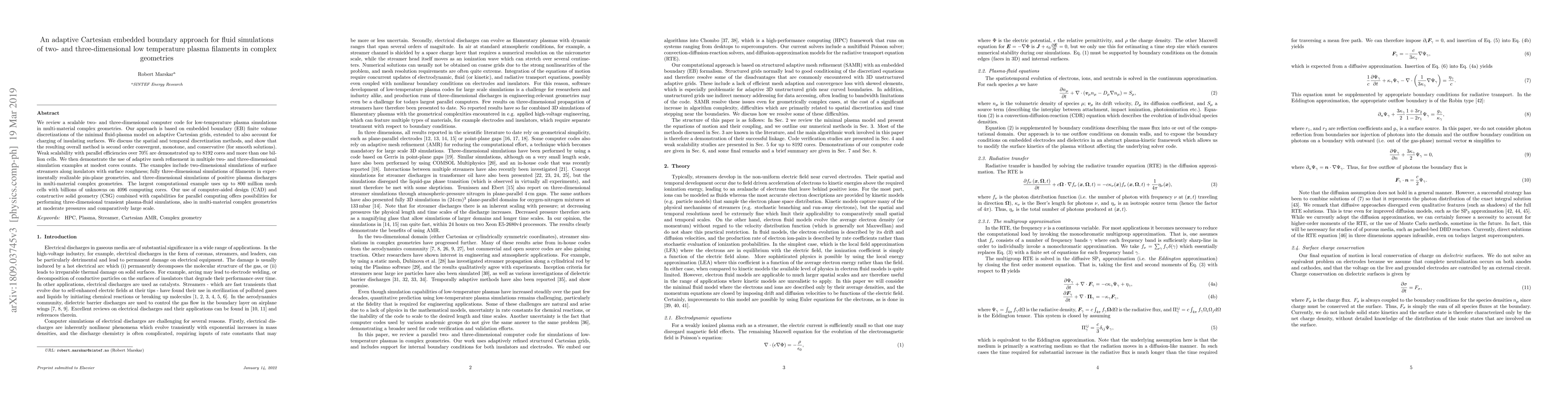 This paper presents an adaptive Cartesian embedded boundary method for simulating low-temperature plasma filaments in complex geometries, demonstrating scalability and efficiency up to 8192 cores. It showcases adaptive mesh refinement and parallel computing capabilities in multi-material scenarios.