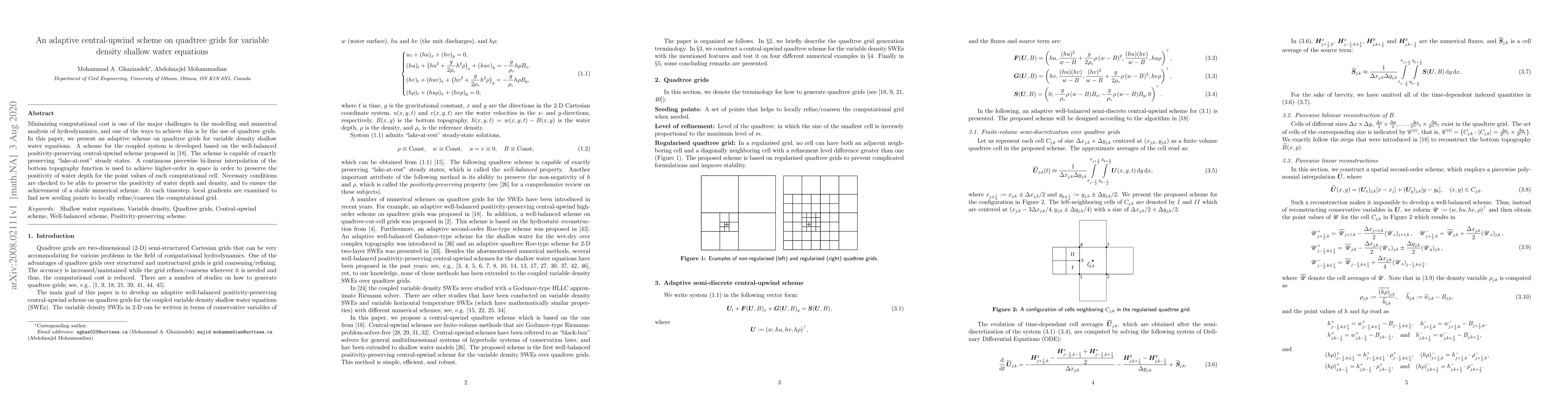 This paper introduces an adaptive central-upwind scheme on quadtree grids for solving variable density shallow water equations, aiming to minimize computational costs. The scheme preserves steady states and positivity of water depth, and refines/coarsens the grid based on local gradients.