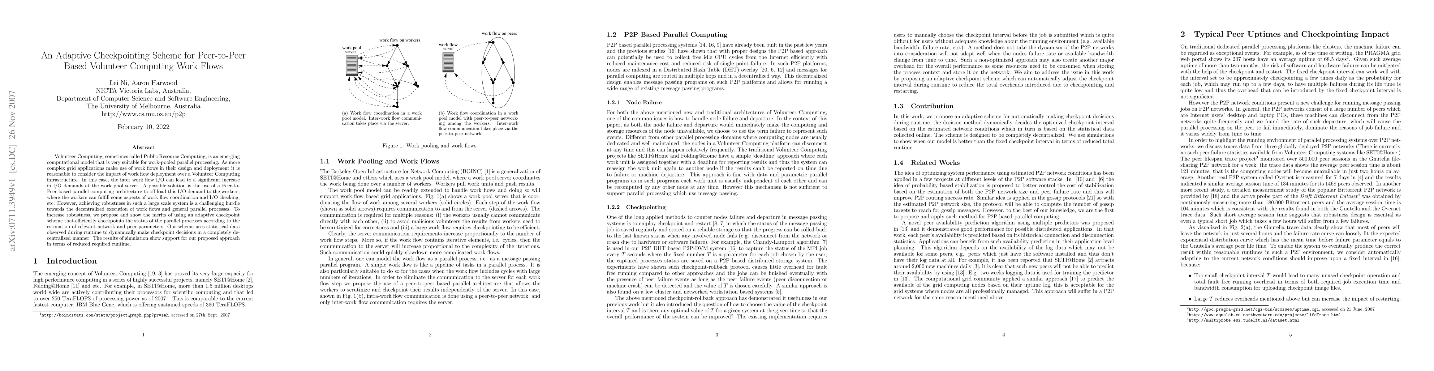 Volunteer Computing, sometimes called Public Resource Computing, is an emerging computational model that is very suitable for work-pooled parallel processing. As more complex grid applications make use of work flows in their design and deployment it is reasonable to consider the impact of work flow deployment over a Volunteer Computing infrastructure. In this case, the inter work flow I/O can lead to a significant increase in I/O demands at the work pool server. A possible solution is the use of a Peer-to- Peer based parallel computing architecture to off-load this I/O demand to the workers; where the workers can fulfill some aspects of work flow coordination and I/O checking, etc. However, achieving robustness in such a large scale system is a challenging hurdle towards the decentralized execution of work flows and general parallel processes. To increase robustness, we propose and show the merits of using an adaptive checkpoint scheme that efficiently checkpoints the status of the parallel processes according to the estimation of relevant network and peer parameters. Our scheme uses statistical data observed during runtime to dynamically make checkpoint decisions in a completely de- centralized manner. The results of simulation show support for our proposed approach in terms of reduced required runtime.