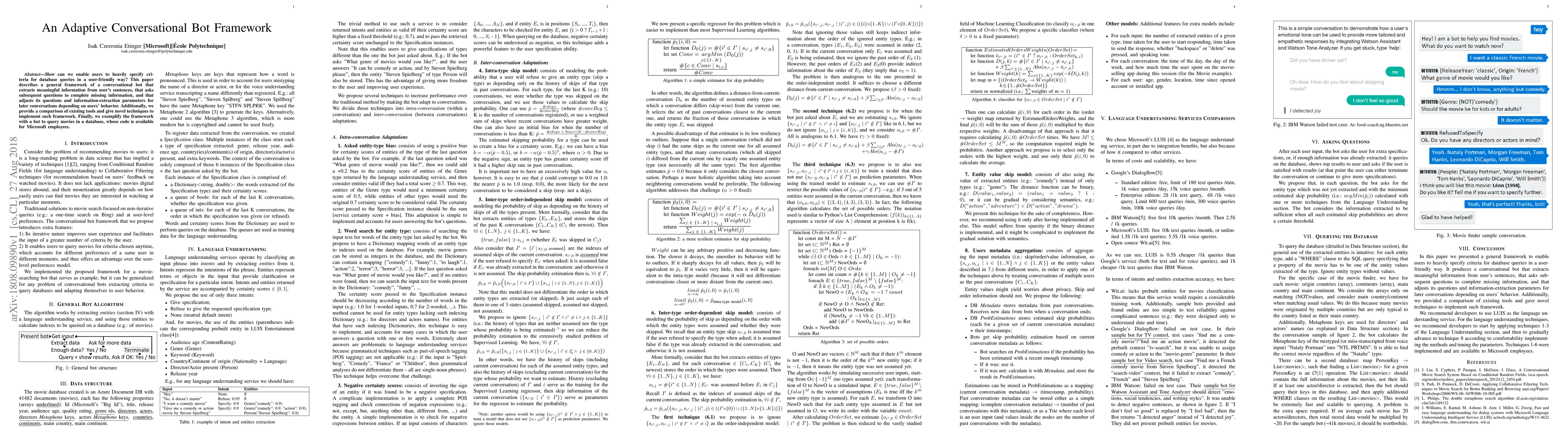 This paper presents an adaptive conversational bot framework that enables users to specify database query criteria through natural language. The framework dynamically adjusts based on user interactions and provides a comparison of existing tools, exemplified by a movie query bot.
