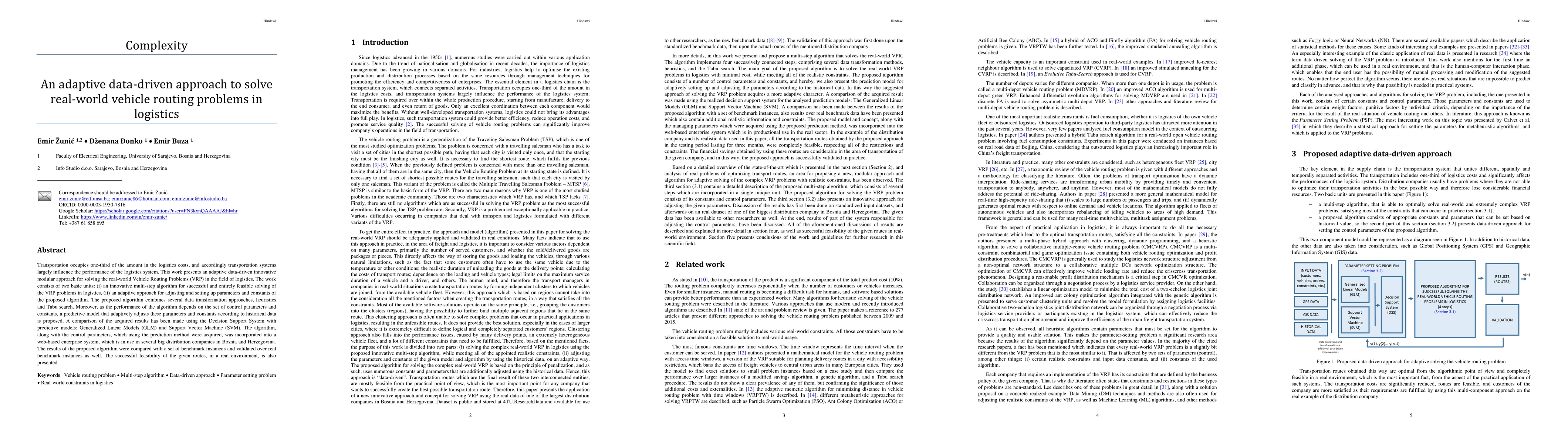 Transportation occupies one-third of the amount in the logistics costs, and accordingly transportation systems largely influence the performance of the logistics system. This work presents an adaptive data-driven innovative modular approach for solving the real-world Vehicle Routing Problems (VRP) in the field of logistics. The work consists of two basic units: (i) an innovative multi-step algorithm for successful and entirely feasible solving of the VRP problems in logistics, (ii) an adaptive approach for adjusting and setting up parameters and constants of the proposed algorithm. The proposed algorithm combines several data transformation approaches, heuristics and Tabu search. Moreover, as the performance of the algorithm depends on the set of control parameters and constants, a predictive model that adaptively adjusts these parameters and constants according to historical data is proposed. A comparison of the acquired results has been made using the Decision Support System with predictive models: Generalized Linear Models (GLM) and Support Vector Machine (SVM). The algorithm, along with the control parameters, which using the prediction method were acquired, was incorporated into a web-based enterprise system, which is in use in several big distribution companies in Bosnia and Herzegovina. The results of the proposed algorithm were compared with a set of benchmark instances and validated over real benchmark instances as well. The successful feasibility of the given routes, in a real environment, is also presented.