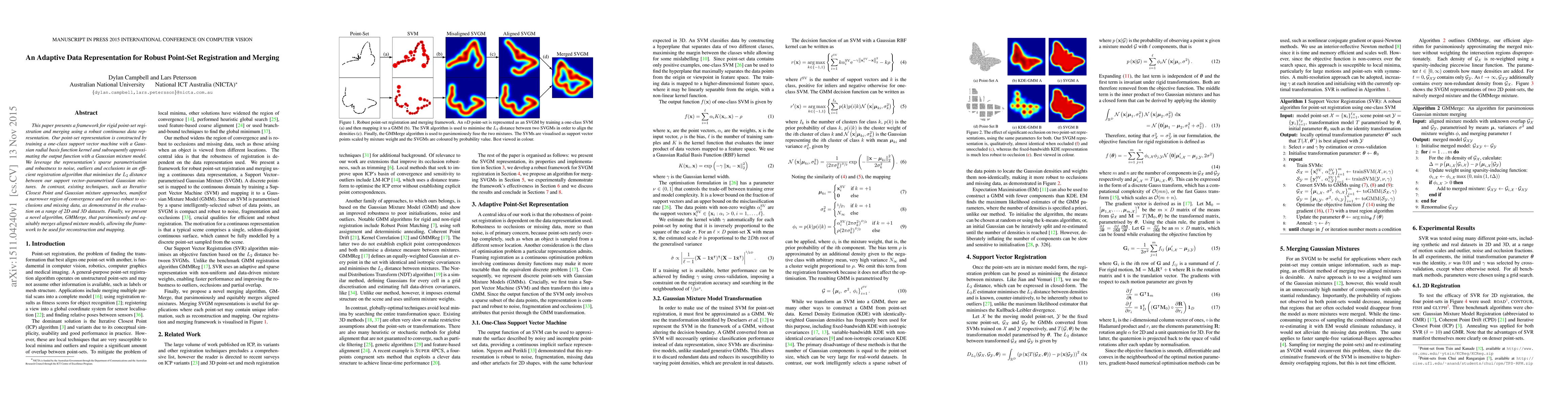This paper presents a framework for rigid point-set registration and merging using a robust continuous data representation. Our point-set representation is constructed by training a one-class support vector machine with a Gaussian radial basis function kernel and subsequently approximating the output function with a Gaussian mixture model. We leverage the representation's sparse parametrisation and robustness to noise, outliers and occlusions in an efficient registration algorithm that minimises the L2 distance between our support vector--parametrised Gaussian mixtures. In contrast, existing techniques, such as Iterative Closest Point and Gaussian mixture approaches, manifest a narrower region of convergence and are less robust to occlusions and missing data, as demonstrated in the evaluation on a range of 2D and 3D datasets. Finally, we present a novel algorithm, GMMerge, that parsimoniously and equitably merges aligned mixture models, allowing the framework to be used for reconstruction and mapping.