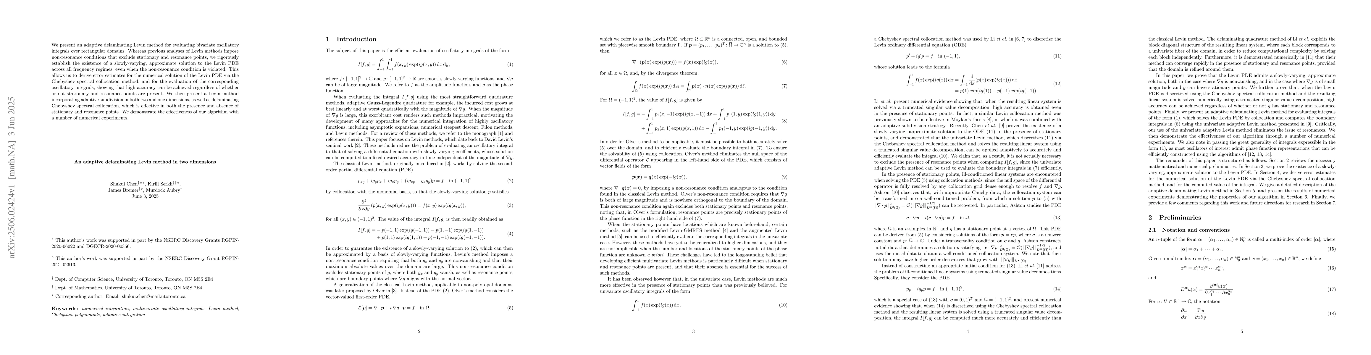 We present an adaptive delaminating Levin method for evaluating bivariate oscillatory integrals over rectangular domains. Whereas previous analyses of Levin methods impose non-resonance conditions that exclude stationary and resonance points, we rigorously establish the existence of a slowly-varying, approximate solution to the Levin PDE across all frequency regimes, even when the non-resonance condition is violated. This allows us to derive error estimates for the numerical solution of the Levin PDE via the Chebyshev spectral collocation method, and for the evaluation of the corresponding oscillatory integrals, showing that high accuracy can be achieved regardless of whether or not stationary and resonance points are present. We then present a Levin method incorporating adaptive subdivision in both two and one dimensions, as well as delaminating Chebyshev spectral collocation, which is effective in both the presence and absence of stationary and resonance points. We demonstrate the effectiveness of our algorithm with a number of numerical experiments.