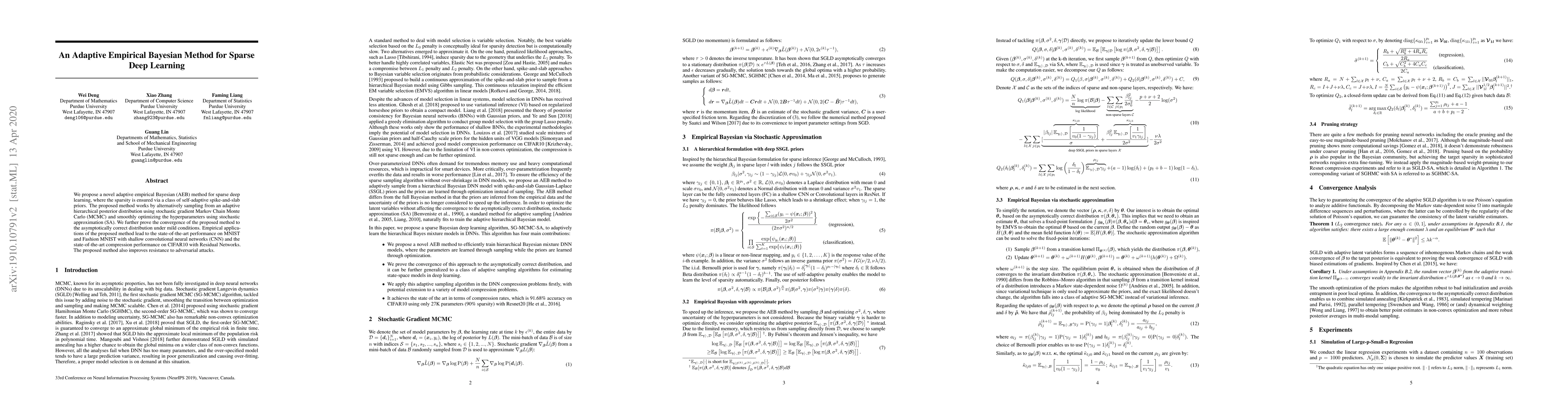 The research introduces an adaptive empirical Bayesian method for sparse deep learning, utilizing self-adaptive spike-and-slab priors. This method combines stochastic gradient MCMC for sampling and stochastic approximation for hyperparameter optimization, ensuring convergence to the correct distribution. It demonstrates superior performance on image classification tasks and compression on CIFAR10, along with enhanced resistance to adversarial attacks.