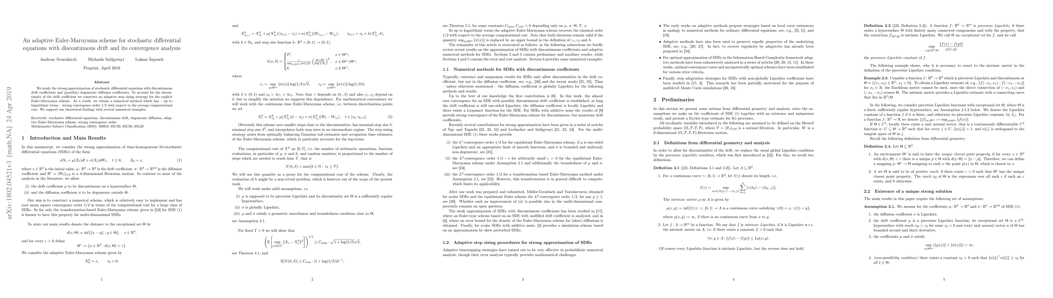 This paper proposes an adaptive Euler-Maruyama scheme for stochastic differential equations with discontinuous drift and possibly degenerate diffusion. The scheme achieves strong convergence order $1/2$ up to logarithmic terms, supported by theoretical analysis and numerical examples.