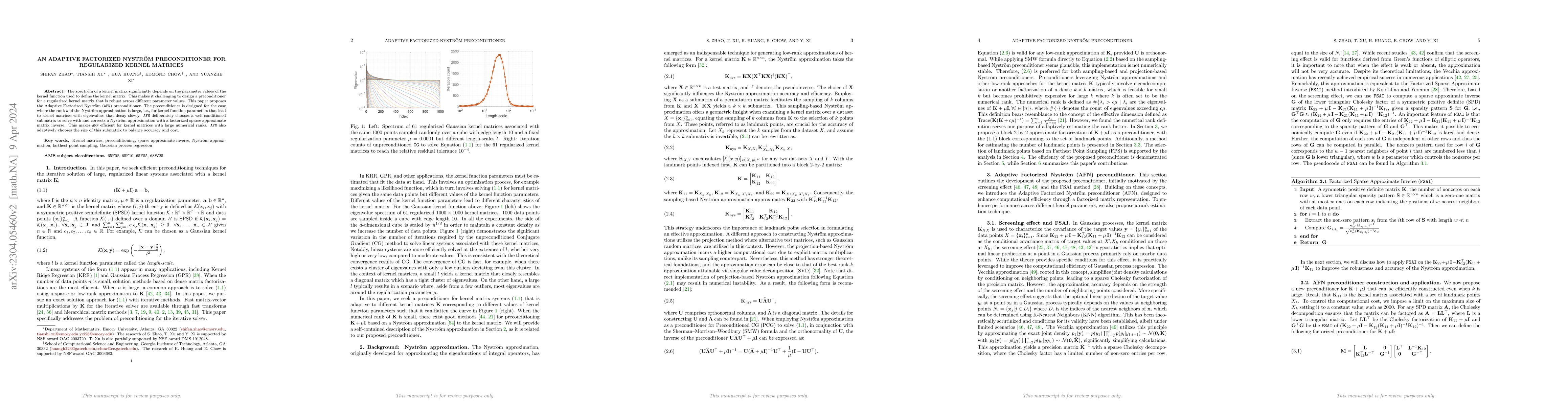 This paper introduces the Adaptive Factorized Nyström (AFN) preconditioner to address the challenge of kernel matrix preconditioning across varying parameter values. The AFN preconditioner is efficient for large rank Nyström approximations by selecting a well-conditioned submatrix and using a factorized sparse approximate inverse, while adaptively balancing accuracy and computational cost.