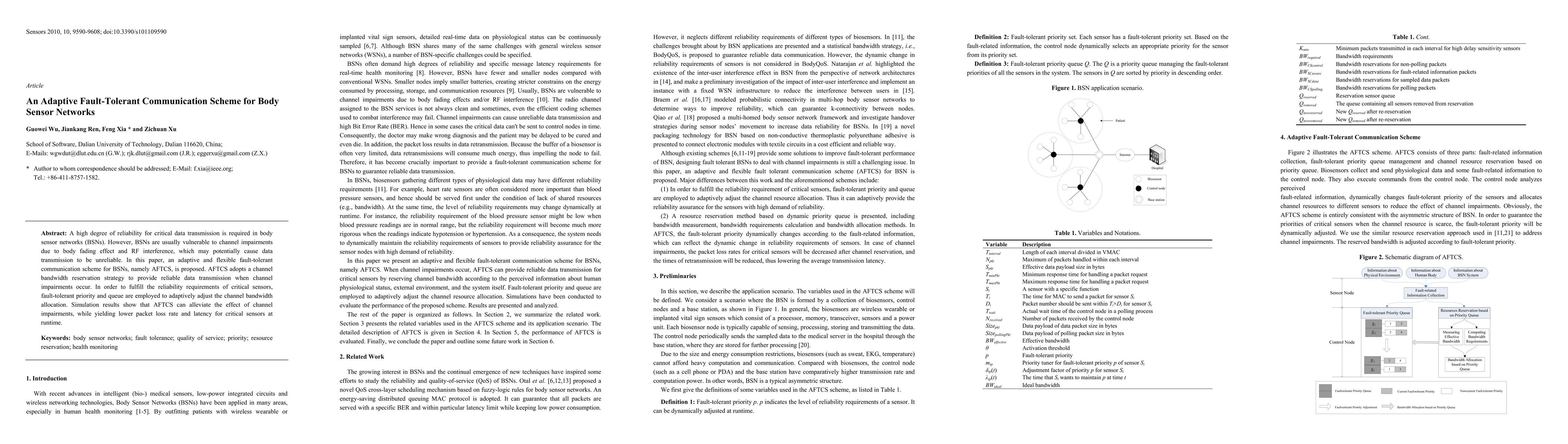 This paper proposes an adaptive fault-tolerant communication scheme (AFTCS) for body sensor networks (BSNs) to ensure reliable data transmission amidst channel impairments. AFTCS utilizes a channel bandwidth reservation strategy and adaptive fault-tolerant priority to minimize packet loss and latency for critical sensors.