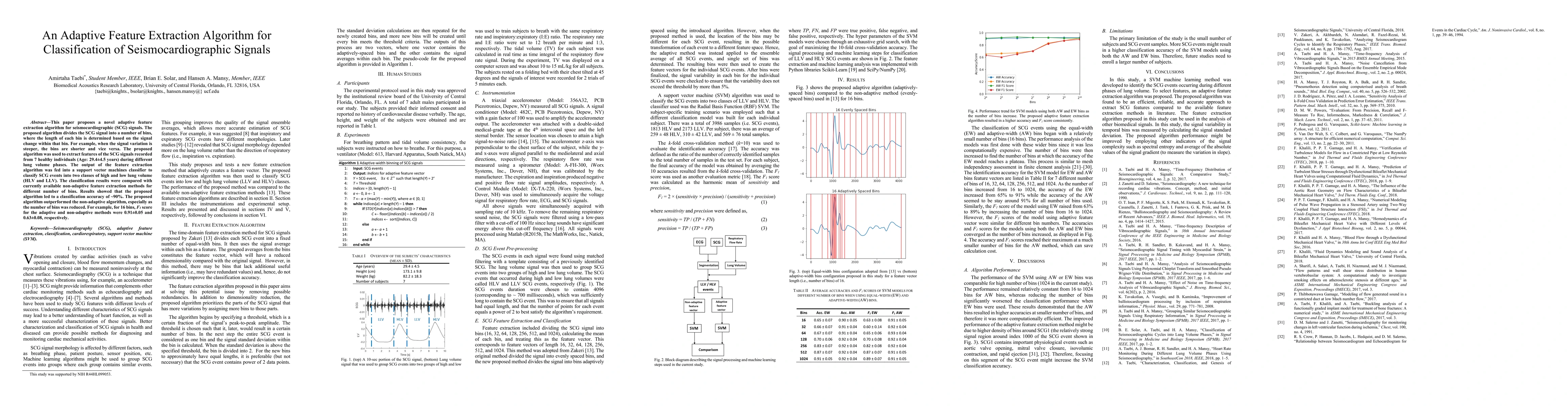 This paper introduces an adaptive feature extraction algorithm for classifying seismocardiographic signals, achieving ~90% accuracy. The algorithm dynamically adjusts bin lengths based on signal variation, outperforming non-adaptive methods, especially with fewer bins.