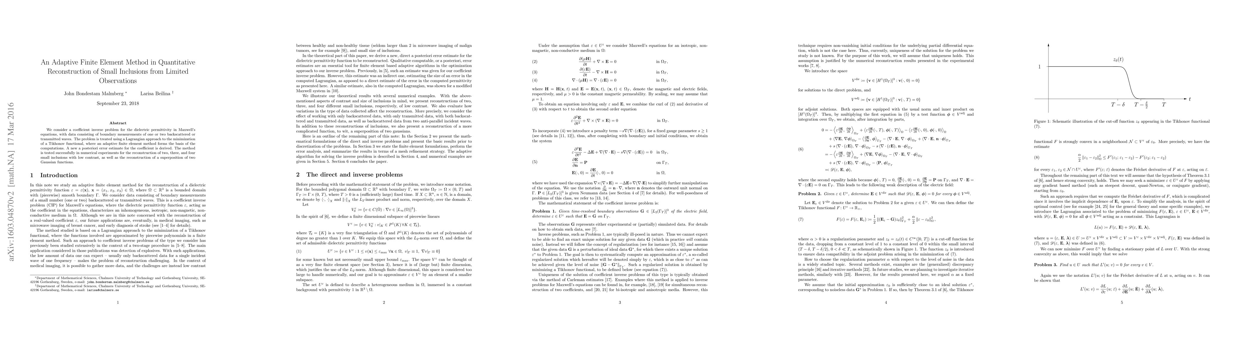 We consider a coefficient inverse problem for the dielectric permittivity in Maxwell's equations, with data consisting of boundary measurements of one or two backscattered or transmitted waves. The problem is treated using a Lagrangian approach to the minimization of a Tikhonov functional, where an adaptive finite element method forms the basis of the computations. A new a posteriori error estimate for the coefficient is derived. The method is tested successfully in numerical experiments for the reconstruction of two, three, and four small inclusions with low contrast, as well as the reconstruction of a superposition of two Gaussian functions.
