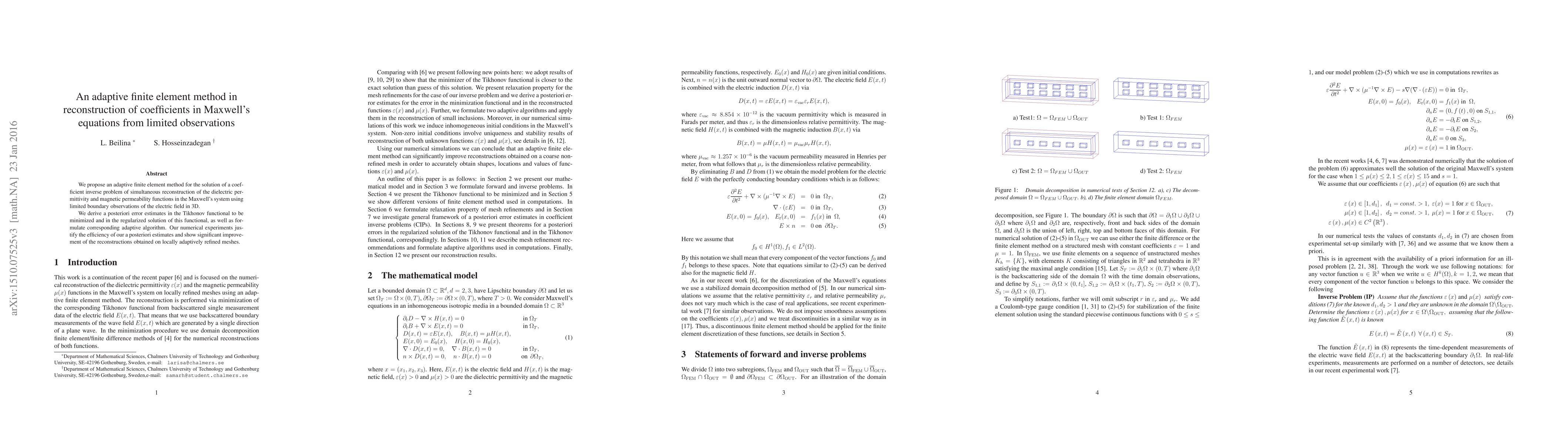 This paper proposes an adaptive finite element method to reconstruct the dielectric permittivity and magnetic permeability functions in Maxwell's equations using limited boundary observations. The method includes a posteriori error estimates and an adaptive algorithm, which are validated through numerical experiments showing improved reconstruction accuracy.