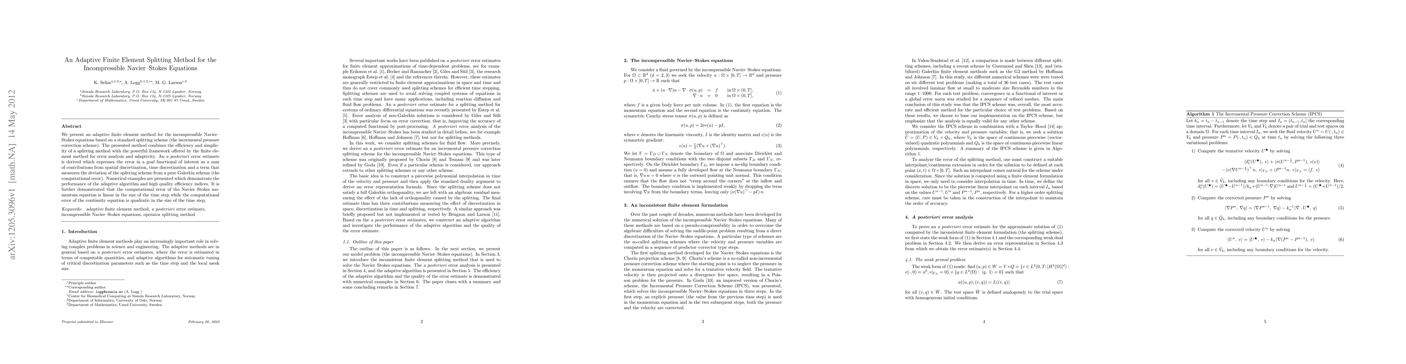 This paper introduces an adaptive finite element method for solving the incompressible Navier-Stokes equations using a splitting scheme, combining the benefits of both splitting and finite element methods. The method's performance is demonstrated through numerical examples showing high efficiency and accuracy, with computational errors analyzed in terms of time step size.