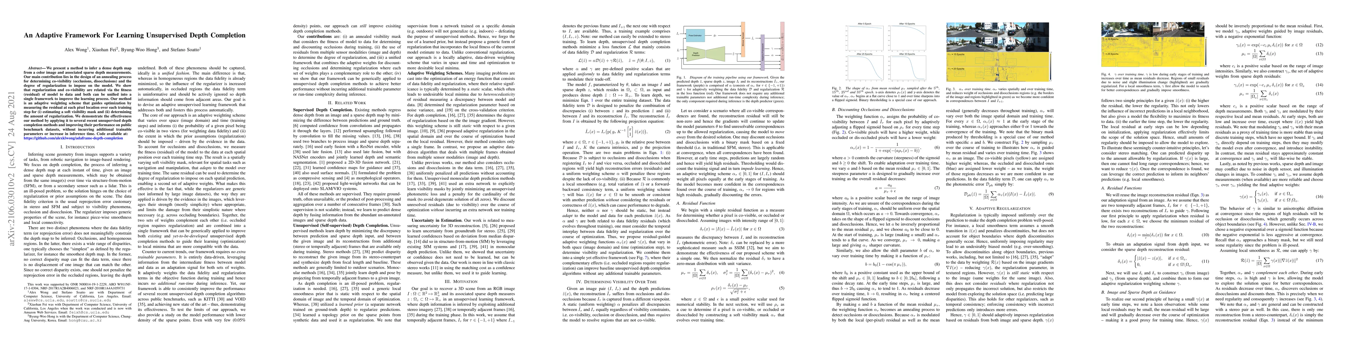 This paper introduces an adaptive framework for unsupervised depth completion using an annealing process to determine co-visibility and regularization, improving the learning process without additional parameters or increased inference time. The method adaptively optimizes by measuring residual and guides the estimation of a soft visibility mask and regularization degree.