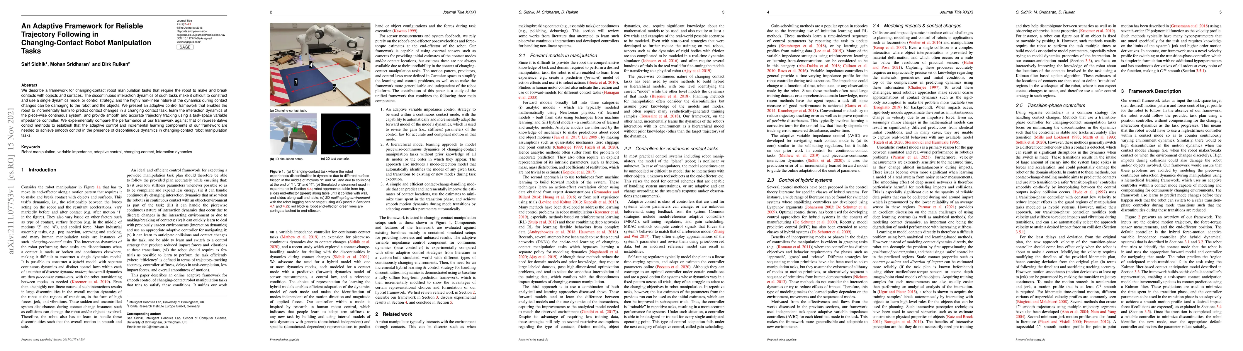 We describe a framework for changing-contact robot manipulation tasks that require the robot to make and break contacts with objects and surfaces. The discontinuous interaction dynamics of such tasks make it difficult to construct and use a single dynamics model or control strategy, and the highly non-linear nature of the dynamics during contact changes can be damaging to the robot and the objects. We present an adaptive control framework that enables the robot to incrementally learn to predict contact changes in a changing contact task, learn the interaction dynamics of the piece-wise continuous system, and provide smooth and accurate trajectory tracking using a task-space variable impedance controller. We experimentally compare the performance of our framework against that of representative control methods to establish that the adaptive control and incremental learning components of our framework are needed to achieve smooth control in the presence of discontinuous dynamics in changing-contact robot manipulation tasks.