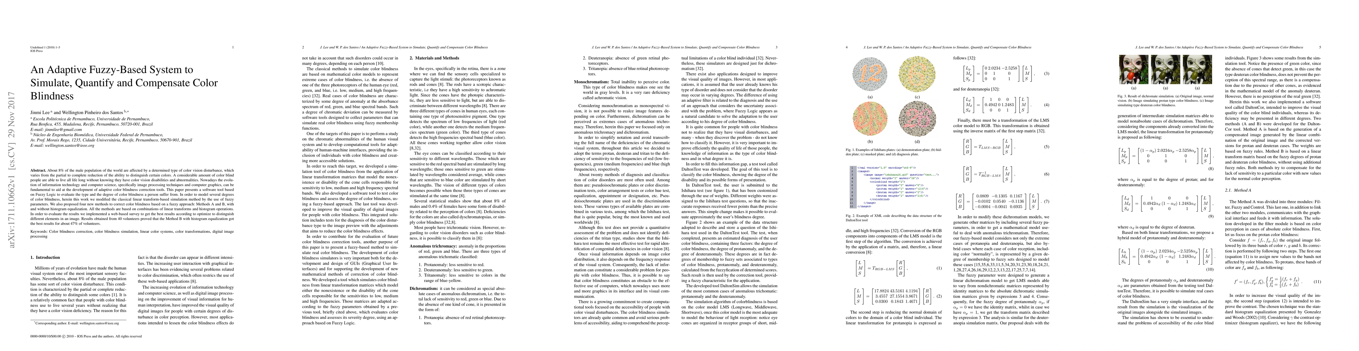 About 8% of the male population of the world are affected by a determined type of color vision disturbance, which varies from the partial to complete reduction of the ability to distinguish certain colors. A considerable amount of color blind people are able to live all life long without knowing they have color vision disabilities and abnormalities. Nowadays the evolution of information technology and computer science, specifically image processing techniques and computer graphics, can be fundamental to aid at the development of adaptive color blindness correction tools. This paper presents a software tool based on Fuzzy Logic to evaluate the type and the degree of color blindness a person suffer from. In order to model several degrees of color blindness, herein this work we modified the classical linear transform-based simulation method by the use of fuzzy parameters. We also proposed four new methods to correct color blindness based on a fuzzy approach: Methods A and B, with and without histogram equalization. All the methods are based on combinations of linear transforms and histogram operations. In order to evaluate the results we implemented a web-based survey to get the best results according to optimize to distinguish different elements in an image. Results obtained from 40 volunteers proved that the Method B with histogram equalization got the best results for about 47% of volunteers.