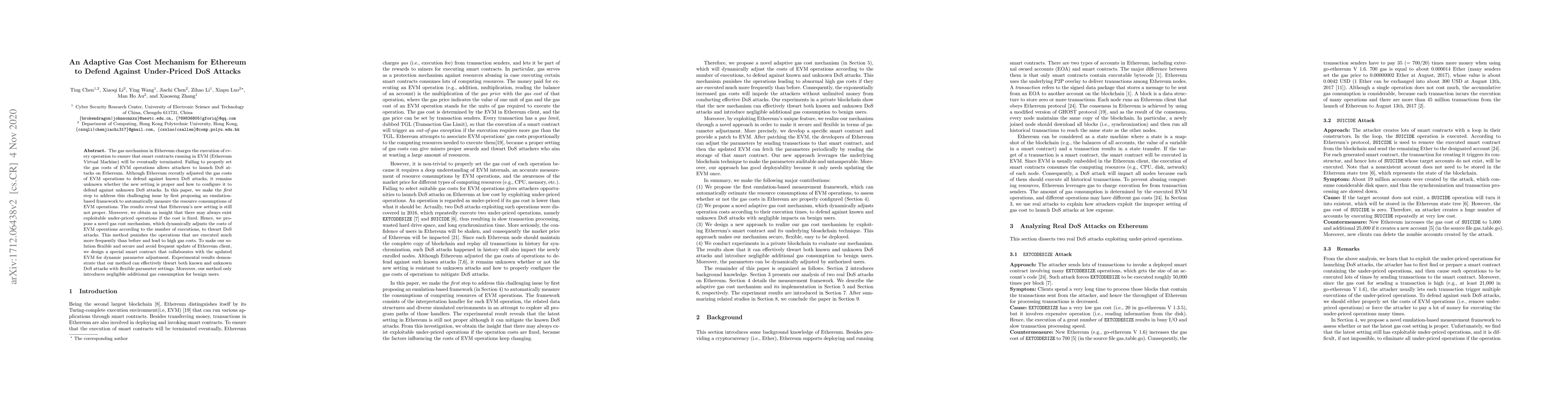 This paper proposes an adaptive gas cost mechanism for Ethereum to defend against under-priced Denial-of-Service (DoS) attacks. It introduces a dynamic adjustment of gas costs based on operation frequency to thwart both known and unknown DoS attacks, while introducing minimal additional gas consumption for regular users.