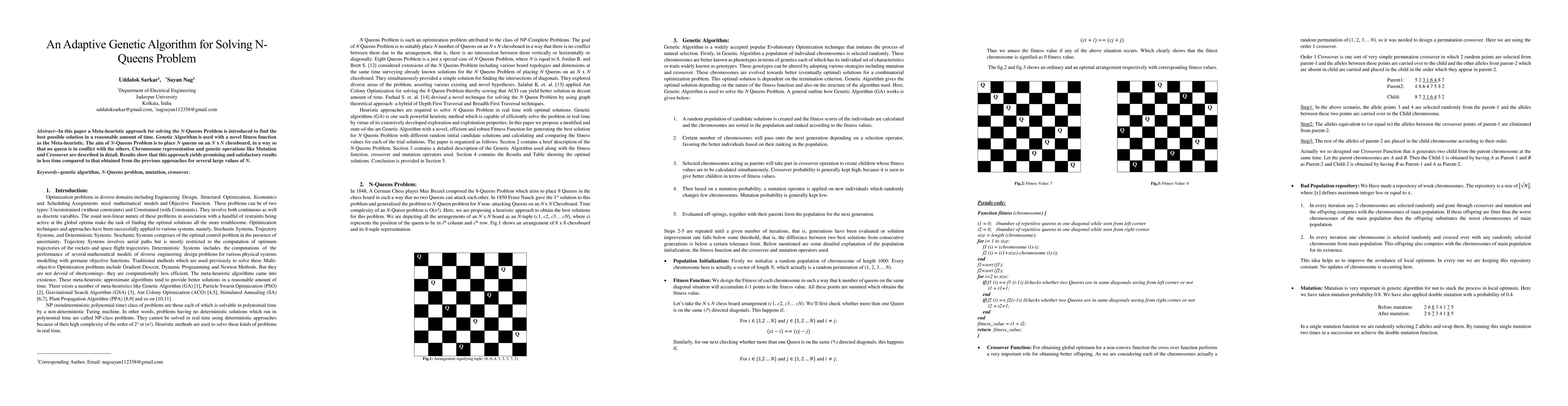 This paper proposes an adaptive genetic algorithm with a novel fitness function to solve the N-Queens Problem efficiently. The genetic algorithm's chromosome representation and genetic operations are detailed, demonstrating promising results for large N values compared to previous methods.