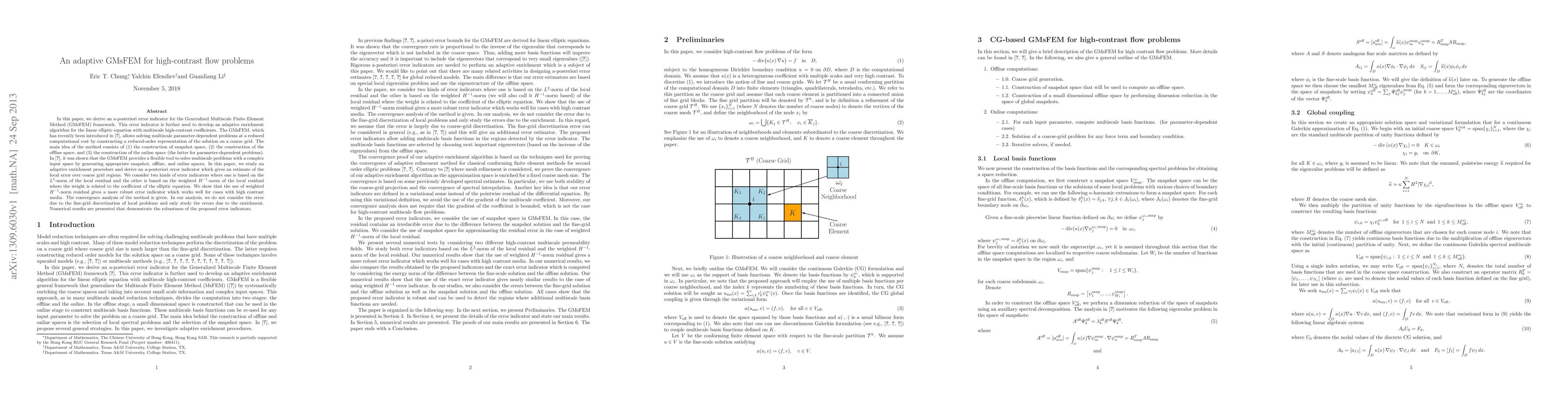 This paper develops an adaptive enrichment algorithm within the Generalized Multiscale Finite Element Method (GMsFEM) framework for solving high-contrast flow problems. It introduces an a-posteriori error indicator based on both $L^2$-norm and weighted $H^{-1}$-norm residuals, showing that the latter provides a more robust estimate for high-contrast media. The method's convergence is analyzed, and numerical results demonstrate its effectiveness.