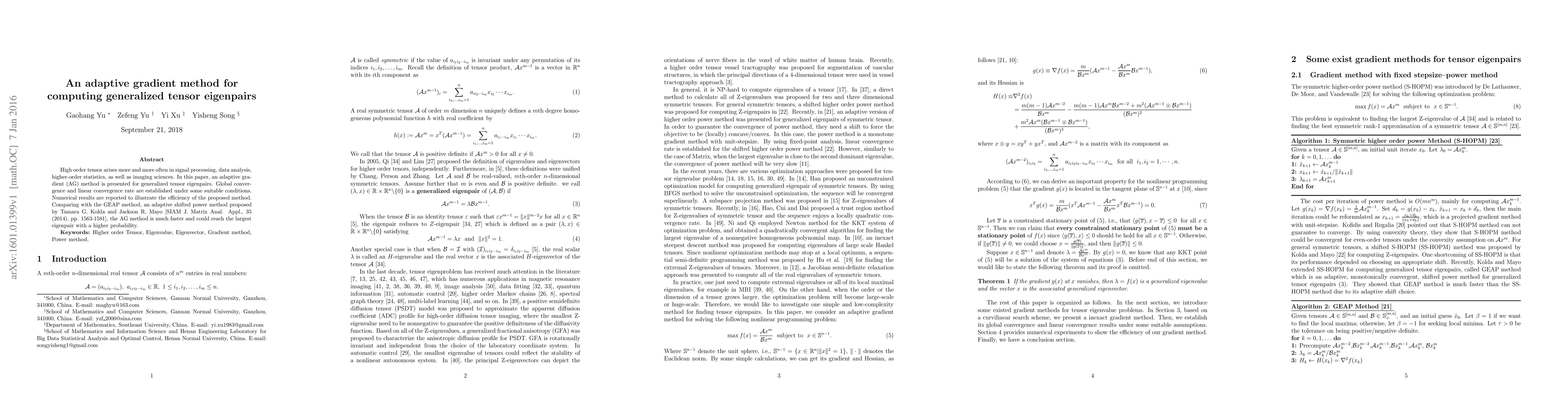 This paper introduces an adaptive gradient (AG) method for computing generalized tensor eigenpairs, demonstrating global and linear convergence. Numerical results show that the AG method is faster and more likely to find the largest eigenpair compared to the GEAP method.