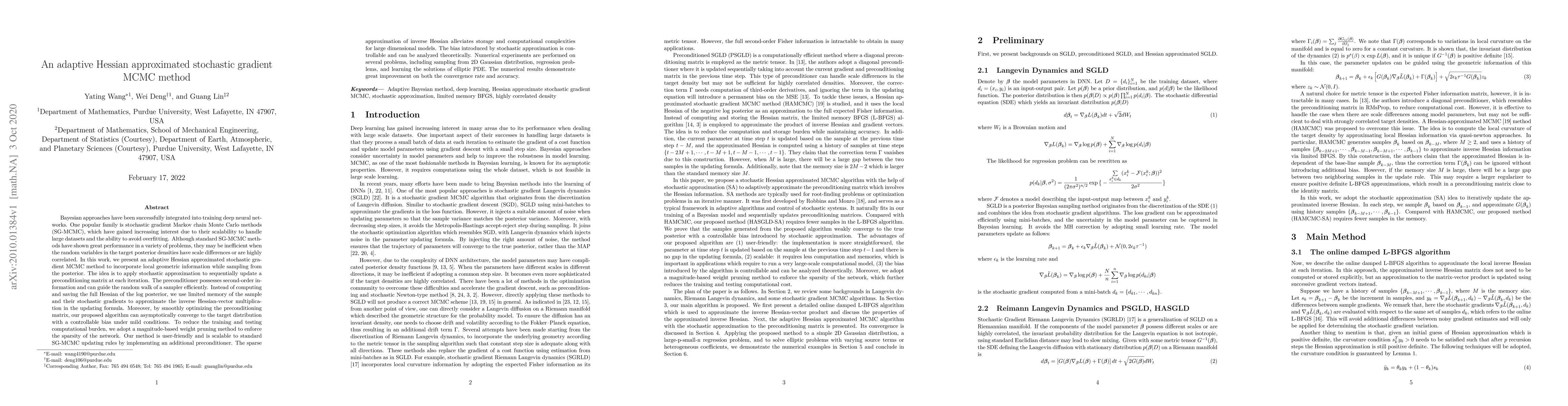 Bayesian approaches have been successfully integrated into training deep neural networks. One popular family is stochastic gradient Markov chain Monte Carlo methods (SG-MCMC), which have gained increasing interest due to their scalability to handle large datasets and the ability to avoid overfitting. Although standard SG-MCMC methods have shown great performance in a variety of problems, they may be inefficient when the random variables in the target posterior densities have scale differences or are highly correlated. In this work, we present an adaptive Hessian approximated stochastic gradient MCMC method to incorporate local geometric information while sampling from the posterior. The idea is to apply stochastic approximation to sequentially update a preconditioning matrix at each iteration. The preconditioner possesses second-order information and can guide the random walk of a sampler efficiently. Instead of computing and saving the full Hessian of the log posterior, we use limited memory of the sample and their stochastic gradients to approximate the inverse Hessian-vector multiplication in the updating formula. Moreover, by smoothly optimizing the preconditioning matrix, our proposed algorithm can asymptotically converge to the target distribution with a controllable bias under mild conditions. To reduce the training and testing computational burden, we adopt a magnitude-based weight pruning method to enforce the sparsity of the network. Our method is user-friendly and is scalable to standard SG-MCMC updating rules by implementing an additional preconditioner. The sparse approximation of inverse Hessian alleviates storage and computational complexities for large dimensional models. The bias introduced by stochastic approximation is controllable and can be analyzed theoretically. Numerical experiments are performed on several problems.