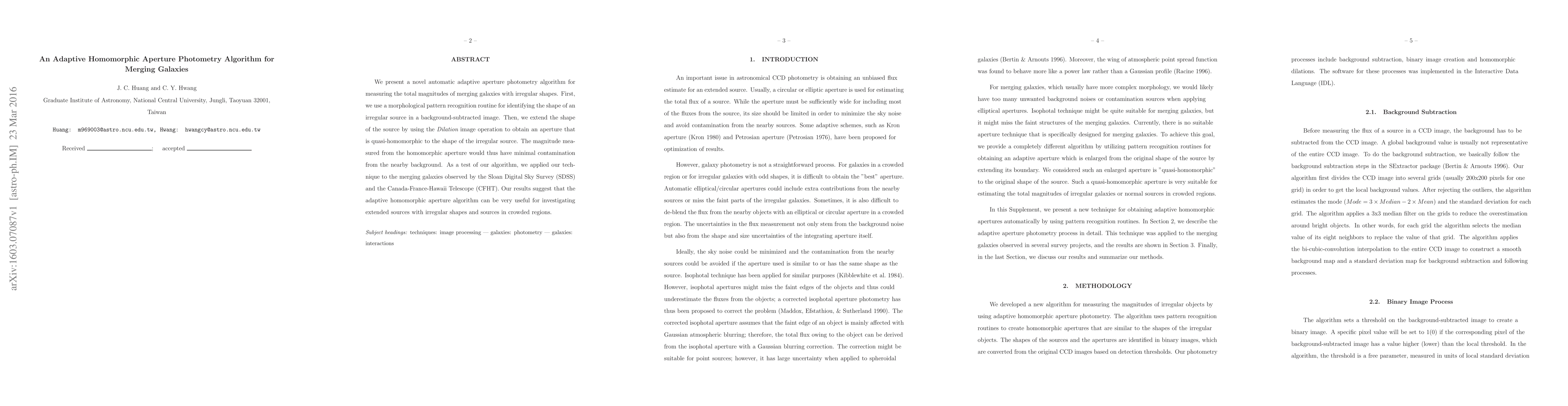This paper introduces an adaptive homomorphic aperture photometry algorithm for measuring the total magnitudes of merging galaxies with irregular shapes. The algorithm uses morphological pattern recognition and dilation operations to create an aperture that minimizes background contamination, and it was tested on galaxies from the SDSS and CFHT surveys.