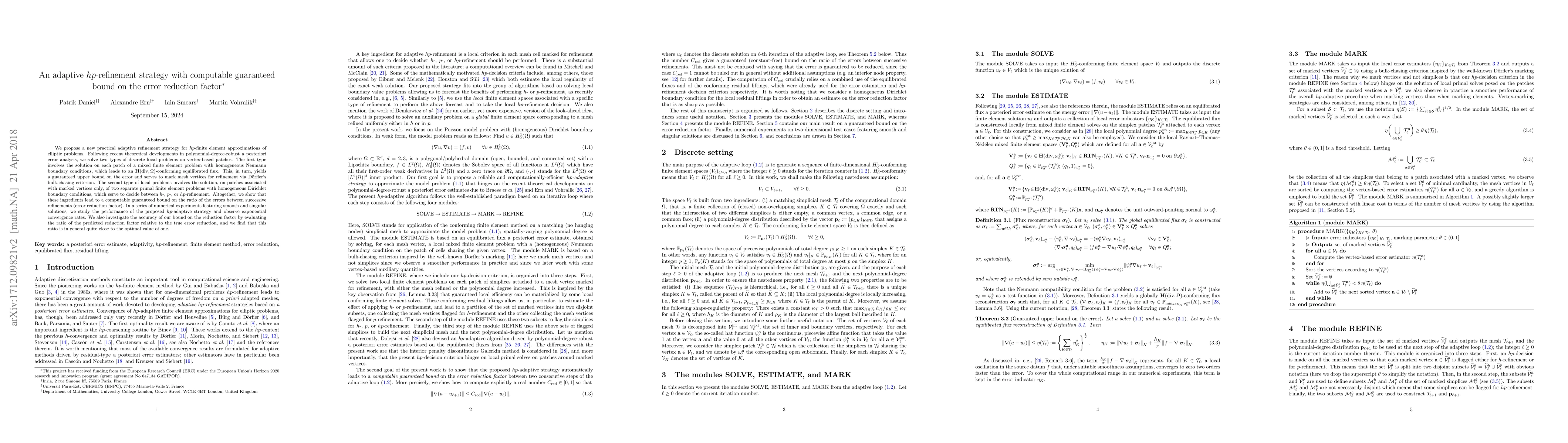 This paper proposes an adaptive $hp$-refinement strategy for elliptic problems, utilizing a posteriori error analysis to determine optimal refinements. The strategy guarantees an upper bound on error reduction and demonstrates exponential convergence in numerical experiments.